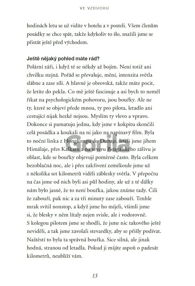 Čekají vás témata vážná i nevážná. Odborná i laická. Dojde na turbulence, nouzová přistání, únosy i zdravotní problémy na palubě. Na své si přijdou letečtí znalci i ti, které létání jen baví. A vlastně i ti, kteří se ho zatím bojí. Otázky kladl novinář Martin Moravec, jehož předchozí knižní rozhovor s neurochirurgem Vladimírem Benešem byl oceněn v anketě Kniha roku.