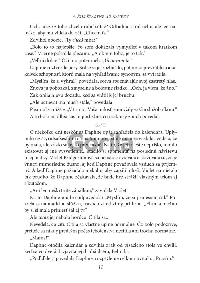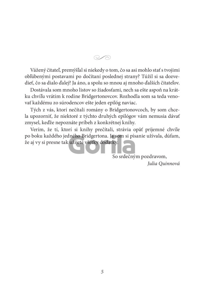Čo sa dialo ďalej? Prečítal Simon niekedy otcove listy? Stali sa Francesca a Michael rodičmi? Kto nakoniec vyhral v Pall Malle? Našli sa tak dlho hľadané šperky? Musí byť KONIEC naozaj koncom? To, či sa všetko skončilo šťastne až na veky sa dozviete v knihe Bridgertonovci: Šťastne až naveky, kde nájdete osem epilógov a bonusový príbeh o samotnej múdrej a vtipnej Violet Bridgertonovej.
