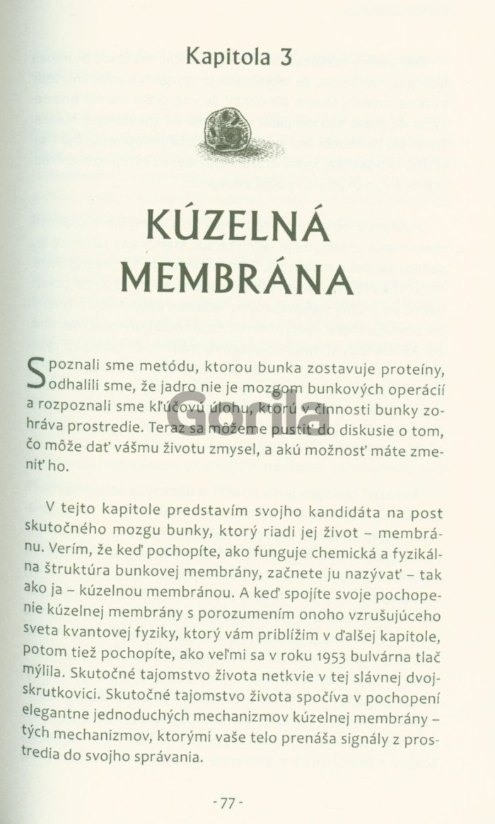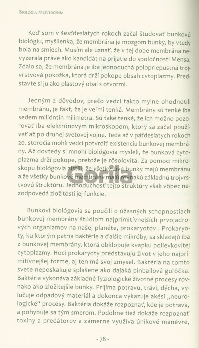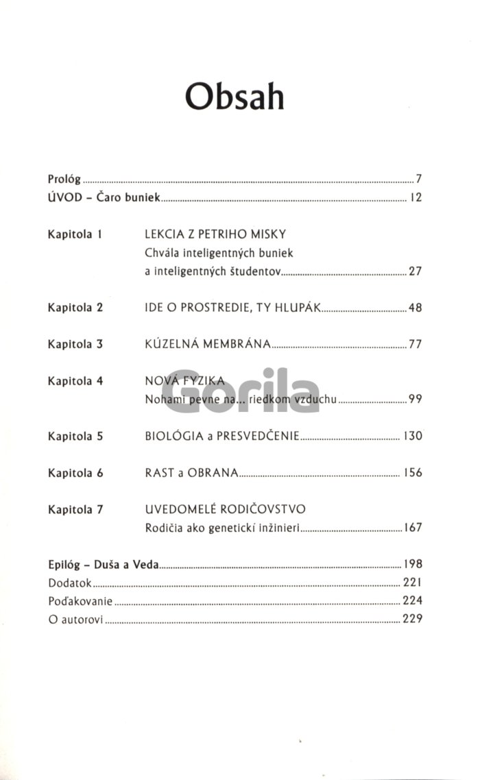 Táto kniha je prelomovým dielom v oblasti tzv. novej biológie. Predstavuje nádejnú syntézu najmodernejšieho a najlepšieho výskumu v oblasti bunkovej biológie a kvantovej fyziky. Je skutočným prelomom v tradičnom myslení, pretože ukazuje, že môžeme zmeniť naše telo, ak preprogramujeme svoje myslenie. Autor pútavo opisuje mechanizmy, akými bunky prijímajú a spracúvajú informácie. Ukazuje sa, že našu biológiu neriadia gény a DNA. Naopak, DNA je riadená signálmi mimo bunky, vrátane energetických odkazov, ktoré vychádzajú z našich pozitívnych aj negatívnych myšlienok.
