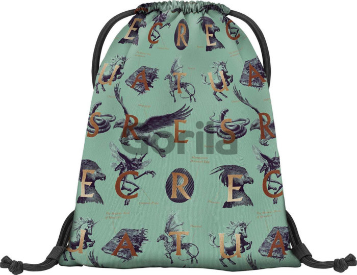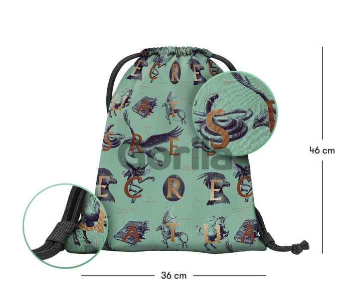Sáček na obuv nebo tělocvik s malým čarodejěm Harry Potterrem a fantastickými zvířaty. Je vyroben z pevného voděodolného materiálu se silnými šňůrami pro pohodlné nošení na zádech.