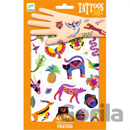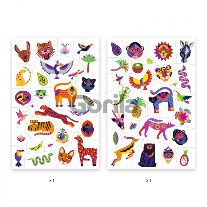 2 hárky dočasných tetovačiek s hýrivými ilustráciami divých zvierat. Metalický lesk zvýrazňuje rozmanitosť farieb a foriem. Jednotlivé tetovačky sa z hárkov ľahko vytrhávajú.