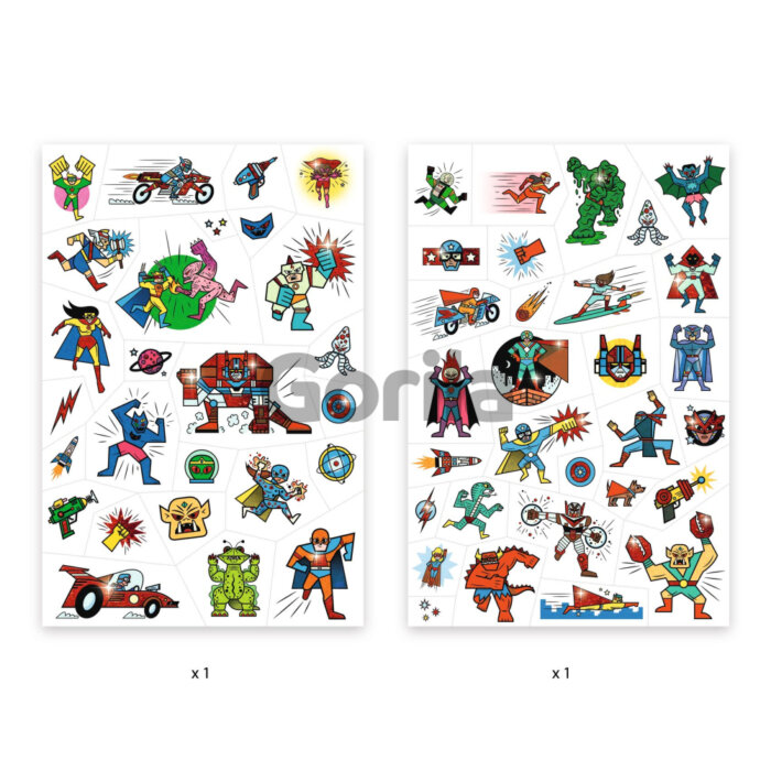 2 hárky dočasných tetovačiek s ilustráciami akčných hrdinov a záporákov. Zvýraznené metalickým leskom. Jednotlivé tetovačky sa z hárkov ľahko vytrhávajú. Aplikácia: odstráňte fóliu, priložte tetovačku na kožu, navlhčite podkladový papier, jemne pritlačte, papier stiahnite. Po obnosení odstráňte mydlovou vodou alebo jemným odličovacím prípravkom.