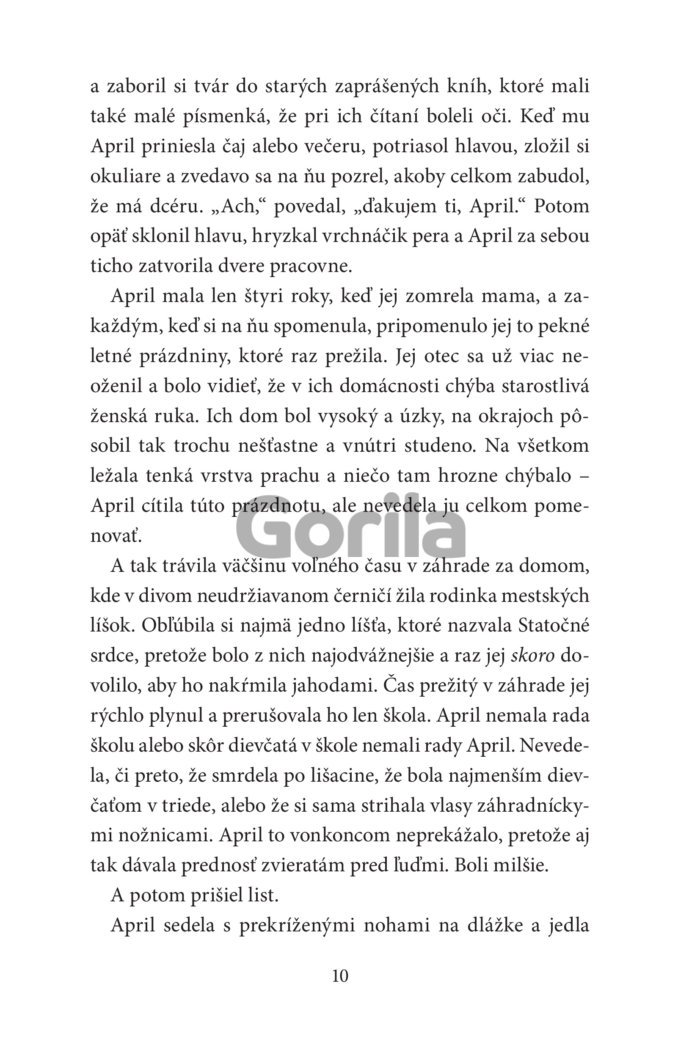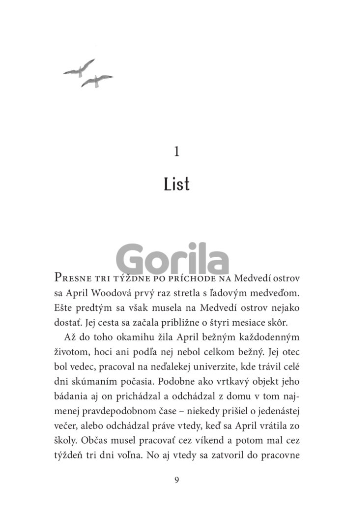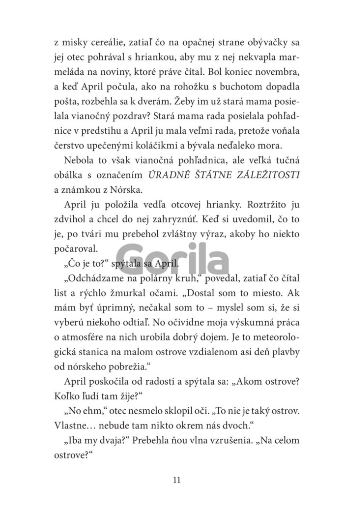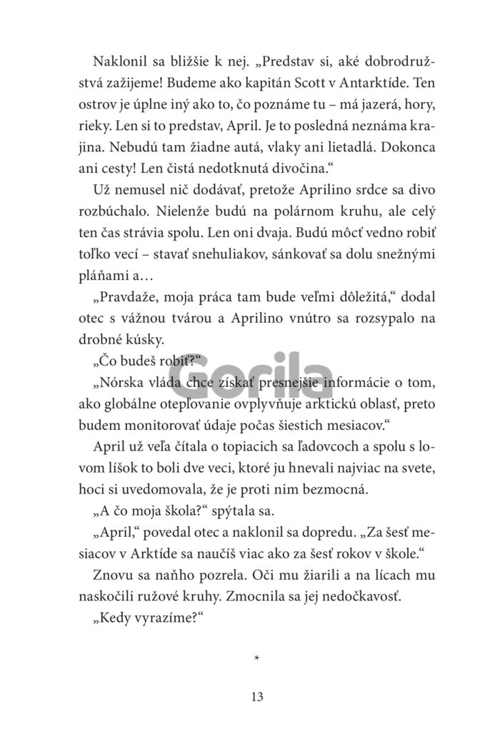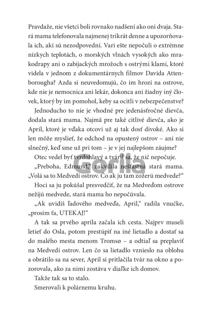 „Očami blúdila po ďalekých horách, búrlivom mori a po zasneženej pláni, ktorá sa pred ňou rozprestierala. Vtom ju niečo zarazilo. Na horizonte proti slnku zazrela nejakú siluetu, ktorá sa pohla. Bol to len zlomok sekundy. Takmer ju prehliadla. Objavilo sa tam niečo nečakané, veľké a bežalo to. Nemohol by to byť…? Znovu zažmurkala. Nech to bolo čokoľvek, už to zmizlo. No April by mohla odprisahať, že práve zazrela ľadového medveďa.“