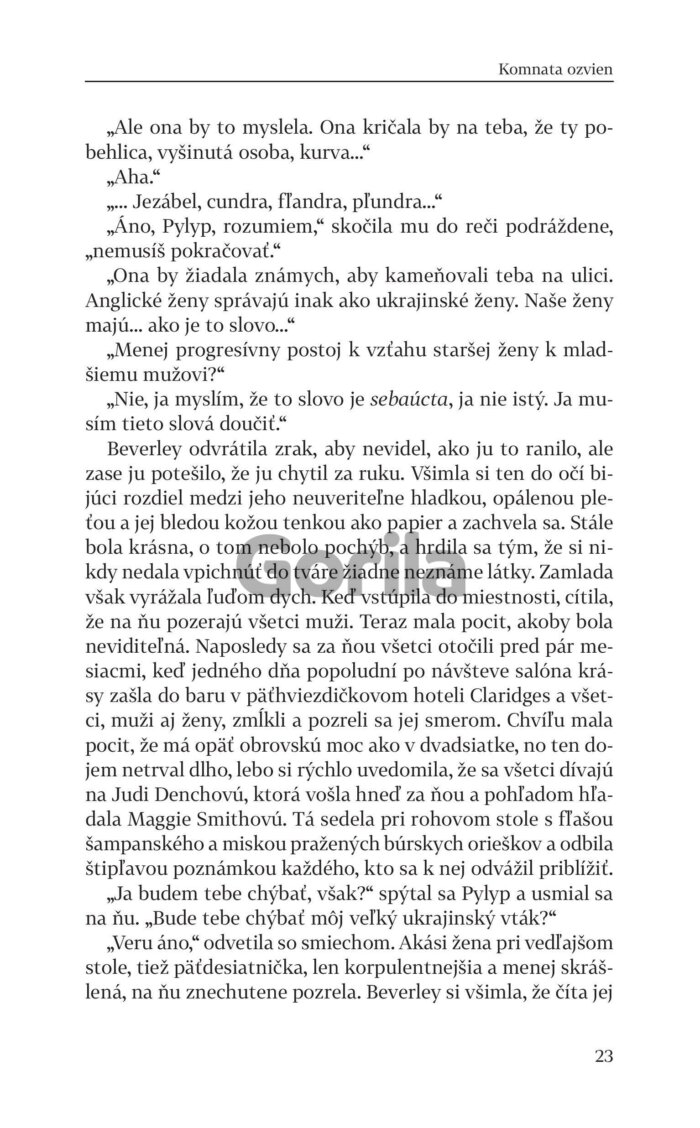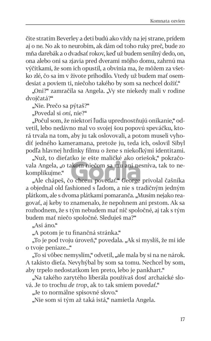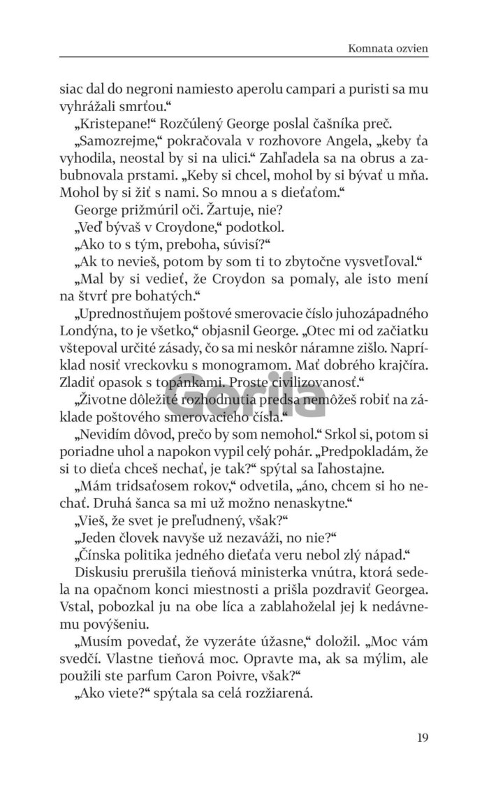 Najnovší román Komnata ozvien skvelého Johna Boynea je neuveriteľne vtipná satira na dnešnú spoločnosť v područí sociálnych sietí, keď jediný príspevok odoslaný z mobilného telefónu na twitter či instagram môže prevrátiť naruby život nielen jednotlivcovi, ale aj celej jeho rodine. Presne to sa stane aj Cleverlyovcom, keď sa hlava rodiny George Cleverly, šestdesiatročný uznávaný moderátor, presvedčený liberál a voľnomyšlienkar dopustí veľkého zločinu - na twitteri omylom označí nesprávnym zámenom recepčného v BBC preoperovaného z muža na ženu. Spustí sa mediálny lynč, lavína urážok a klamstiev, ktorú zastaví jedine oslobodenie sa od sociálnych sietí.