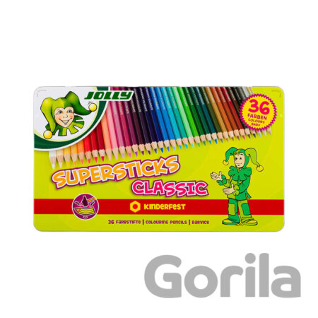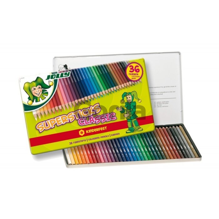 Farbičky Jolly Supersticks Kinderfest sú rokmi overené farebné pastelky značky Jolly. Pastelky Supersticks sa vyznačujú jasnými farbami, výnimočne odolnou drevenou časťou a dôkladne odskúšanými tuhami Jolly, vďaka čomu už niekoľko generácií patria medzi najobľúbenejšie farebné pastelky na kreslenie a maľovanie.