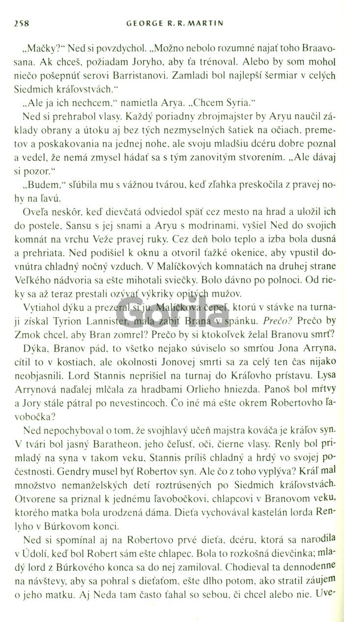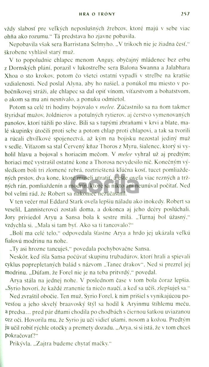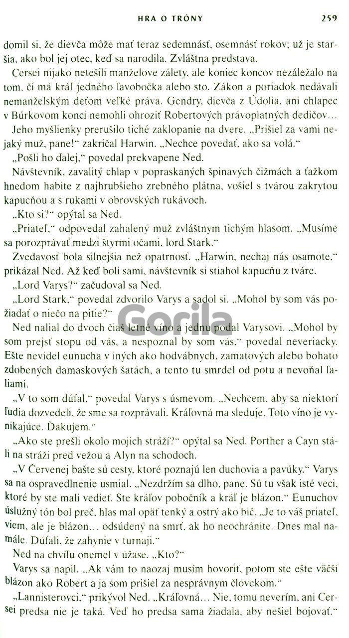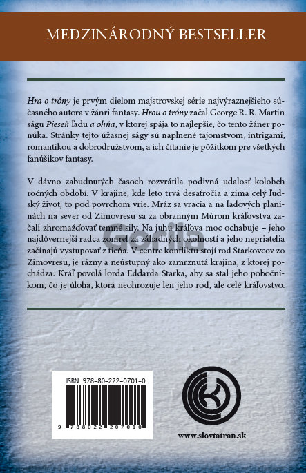 Hra o tróny je prvým dielom majstrovskej série najvýraznejšieho súčasného autora v žánri fantasy. Hrou o tróny začal George R.R. Martin ságu, v ktorej spája to najlepšie, čo tento žáner ponúka. Stránky tejto úžasnej ságy sú naplnené tajomstvom, intrigami, romantikou a dobrodružstvom, ktorých čítanie je pôžitkom pre všetkých fanúšikov fantasy.