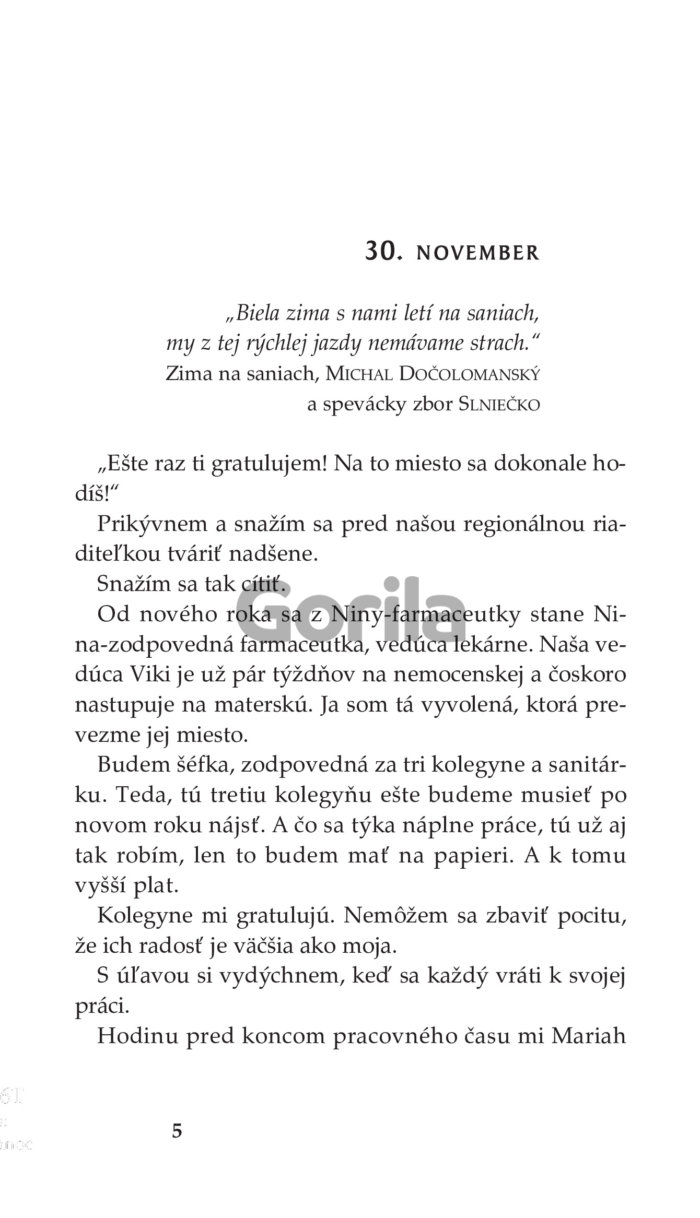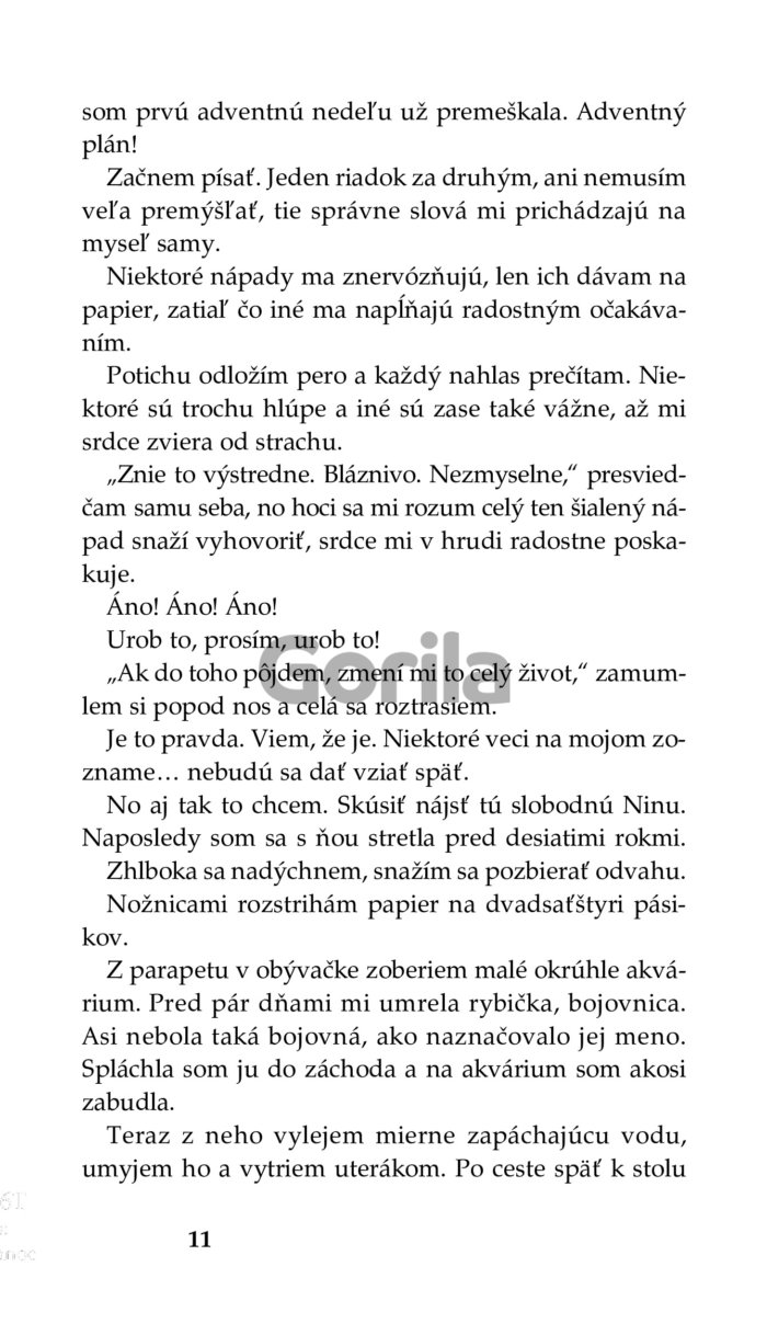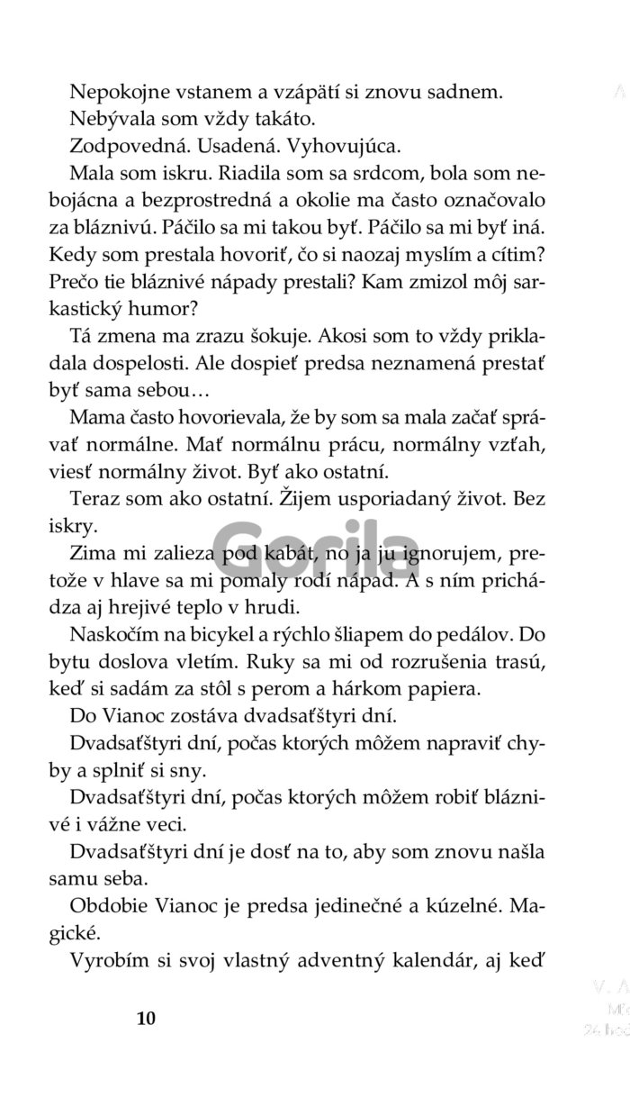 Do Vianoc zostáva dvadsaťštyri dní a Nina začne robiť všetko pre to, aby bola na Štedrý deň opäť sama sebou – vyťahuje zo skrine rodinných kostlivcov, plní si tajné túžby, priznáva boľavé pravdy, napráva staré chyby a uskutočňuje svoje sny. Aj tie pochabé.