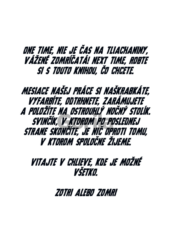 Zomri: Chliev je interaktívna stieracia kniha obsahujúca zbierku tragikomických ilustrácií, ktoré vystihujú, čo sa v našej krajine deje. Nie sú to len trápne obrázky vo väzbe za veľa peňazí. Tieto totiž v sebe skrývajú posolstvo, ktoré si musíte zoškrabať.