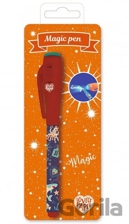Magické pero s neviditelným inkoustem, které lze vidět pouze s pomocí UV světla. UV světlo je zabudované ve víčku pera, baterie jsou součástí balení. Rozměr pera: 13 x 0,5 cm.