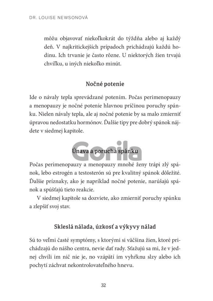 Dezinformácie a stigma, ktoré sú ešte stále okolo menopauzy, spôsobujú, že na ňu nie sme dostatočne pripravené a niekedy netušíme, čo sa s nami bude diať a ako sa s tým čo najlepšie vyrovnať. Dr. Louise Newsonová nám pomocou najnovšieho výskumu, odborných rád a príbehov pacientiek od rôznorodého spektra žien, poskytne odborné rady a praktické tipy, ako toto obdobie prežiť v čo najlepšom psychickom i fyzickom zdraví.