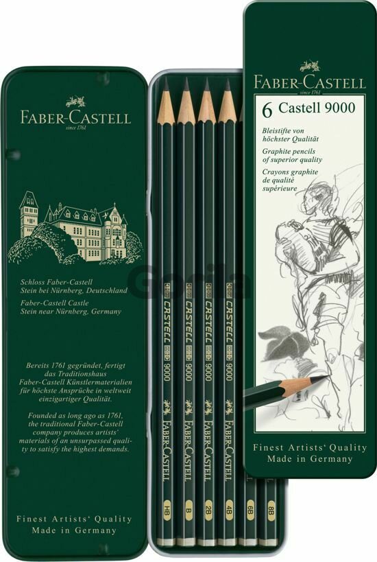 Castell 9000 - skutočná klasika. Ceruzku Castell 9000 uviedol na trh gróf Alexander von Faber-Castell ešte v roku 1905. Tuha pevne vlepená do dreva zaručuje mimoriadnu odolnosť proti lámaniu. Pre vysokú kvalitu a jemne odstupňované tvrdosti tuhy sa ceruzka stala nerozlučnou súčasťou výbavy umelcov a ilustrátorov. Zelená farba a motív rytiera sú známkou kvality a tradície.