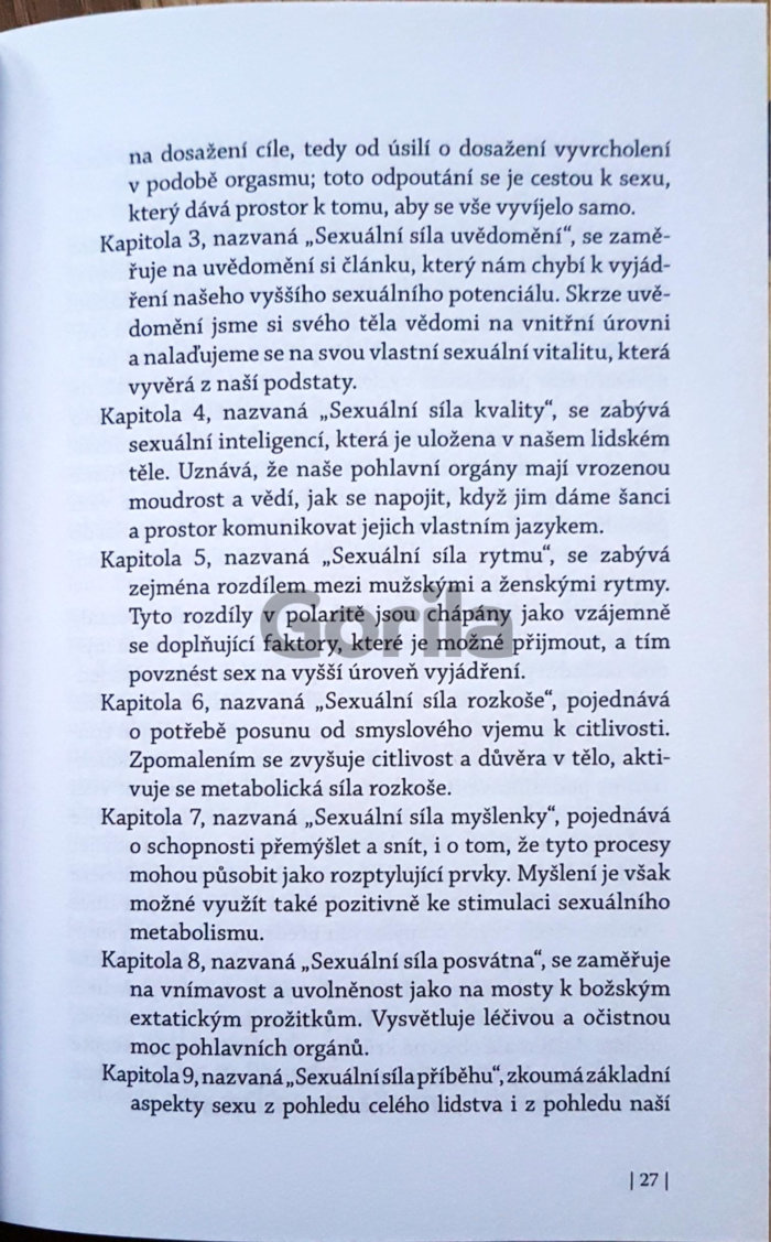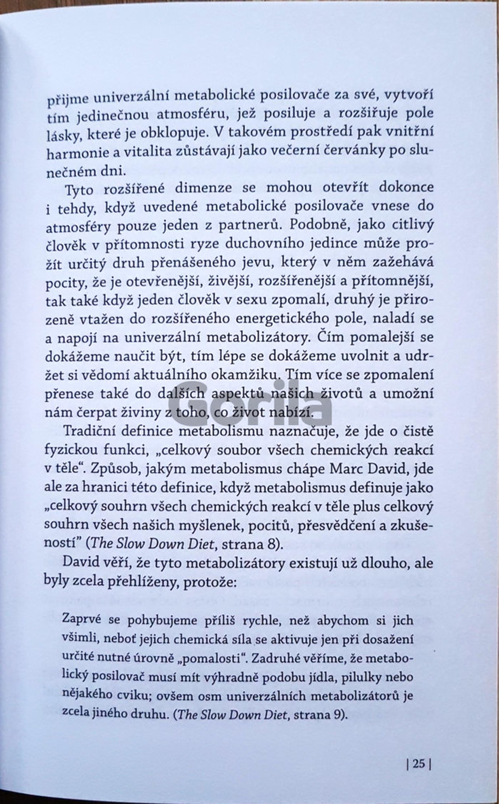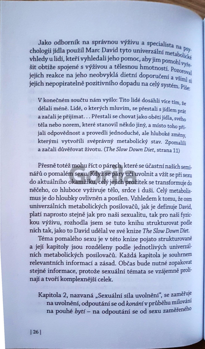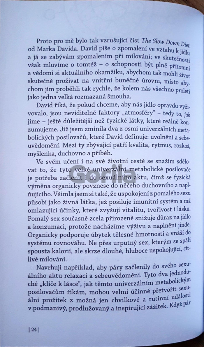 Kniha Pomalý sex představuje první knihu Diany Richardson, která se dostává do rukou českému čtenáři, o zcela novém pohledu na sexualitu, totiž knihu o vědomém milování. Tento přístup k sexualitě má nesmírně vyživující, léčivé a zcela nové roviny odhalující účinky vášně! Konečně skvělá kniha o sexu - přirozená, upřímná, hluboká a zemitá, ukazující roviny intimity mnohonásobně překračující „vzrušující techniky a pozice“ a „ezoterický přístup učení o čakrách a duchovnu“. Díky popsanému přístupu k sexu se budete moci vnořit přímo do podstaty zdroje naší základní životní síly, prohloubit ve svém životě lásku a objevit vitalitu, radost a vášeň, o které jste ani netušili!