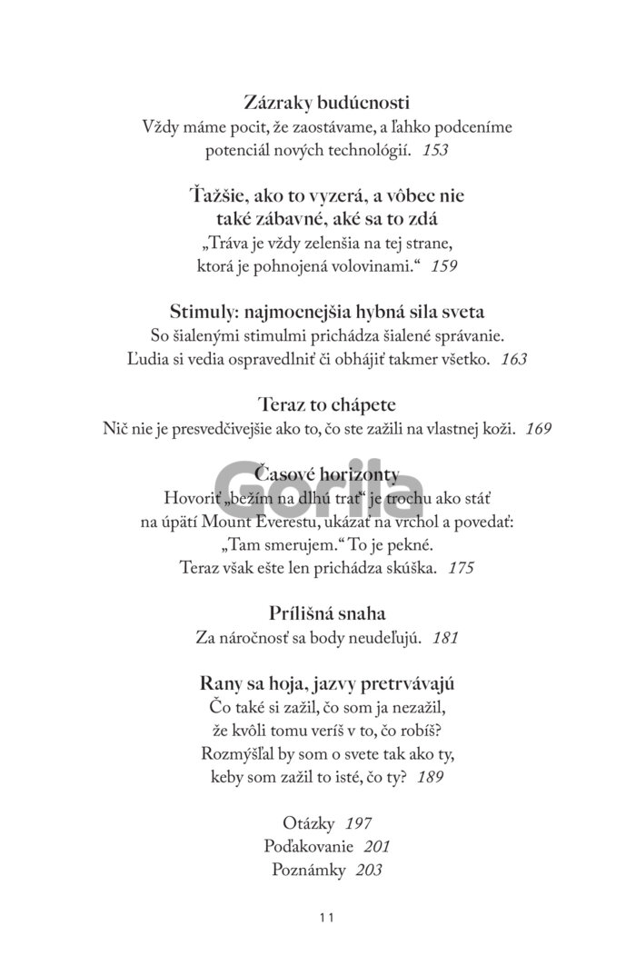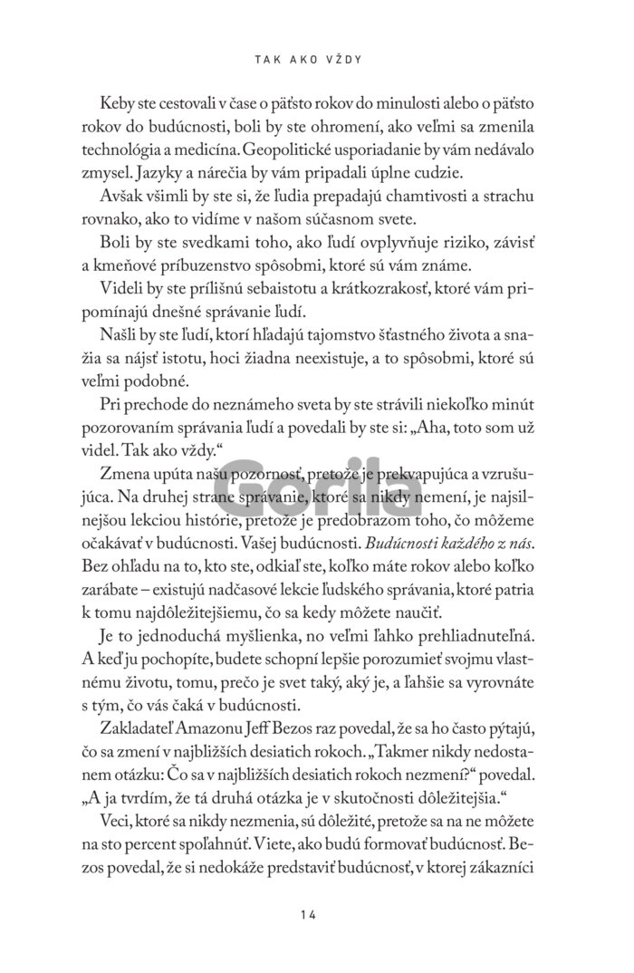 Namiesto toho by sme si mali klásť inú otázku: „Čo bude v budúcnosti rovnaké ako teraz?“ Poznatky o veciach, ktoré sa nikdy nezmenia, sú užitočnejšie a dôležitejšie ako neistá predpoveď o neznámej budúcnosti. V knihe Tak ako vždy sa autor bestsellerov Morgan Housel podelil o 24 krátkych príbehov, ktoré ilustrujú, v čom sa život, ľudské správanie a podnikanie nikdy nemenia. Keď uvidíte, ako sa známe témy v blízkom čase opäť opakujú, prikývnete a poviete si: „Áno, tak ako vždy.“ Tieto nové poznatky a sebadôvera vám pomôžu na ceste k lepšiemu životu.