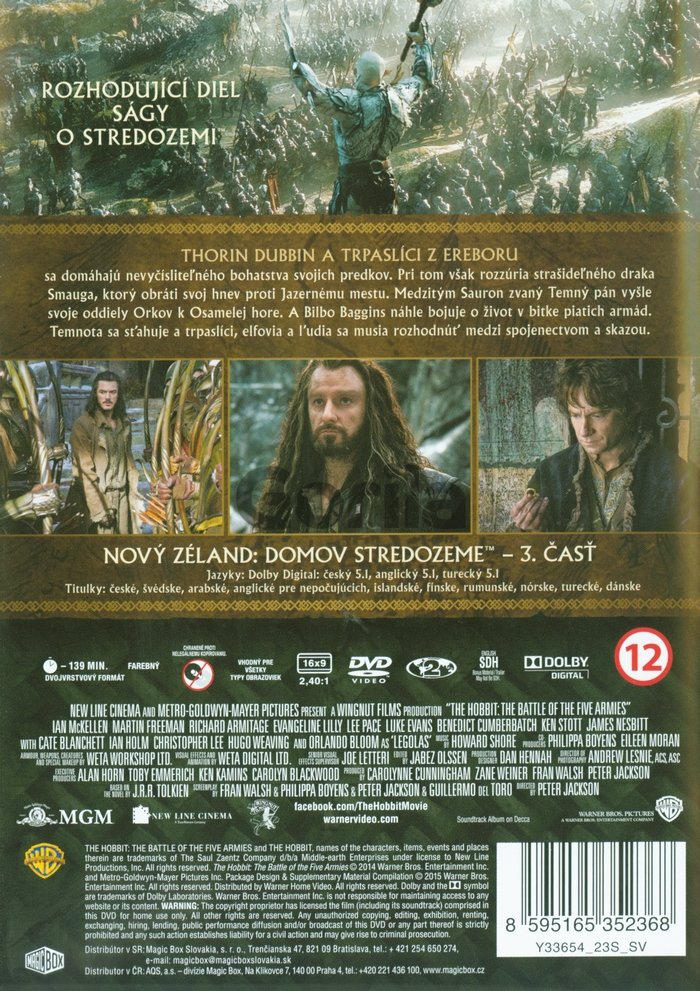 Originálny názov: The Hobbit: The Battle of the Five Armies Rok vydania: 2015 Katalógové číslo: W01797 Rozmer: 135×190 mm Dĺžka: 139 Obal: DVD obal Titulky: české, anglické pro neslyšící, arabské, dánské, finské, islandské, norské, rumunské, švédské, turecké Jazyk: slovenčina, čeština, angličtina, turečtina