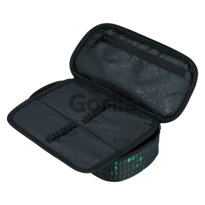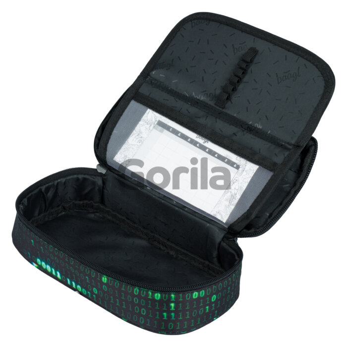 Černý chlapecký penál s výrazným zeleným potiskem. Doporučujeme od 3. třídy ZŠ. • Pevný školní penál s výklopnou vnitřní přepážkou. • Vnitřní kapsa na zip a kapsa na rozvrh. • Bez náplně. • Materiál: 100% Polyester