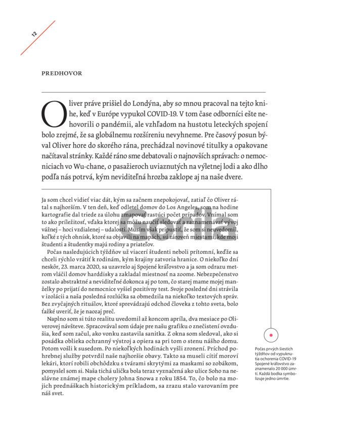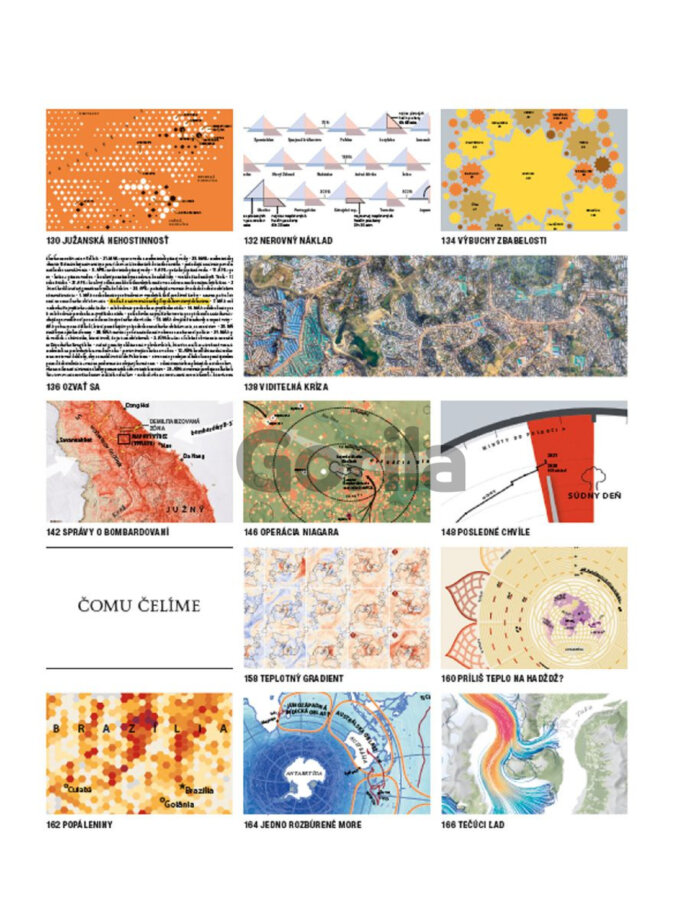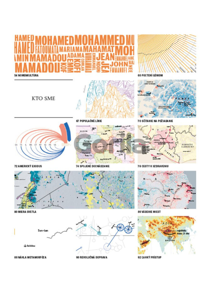 Oceňovaný geograficko-dizajnérsky tím James Cheshire a Oliver Uberti premieňa rozsiahle súbory dát na pestré mapy a špičkové vizualizácie. V tomto triumfe vizuálneho rozprávania príbehov autori odhaľujú pravdu o našej minulosti, ukazujú, kto sme dnes, a upozorňujú na to, čo náš čaká v nasledujúcich rokoch. Svojím entuziastickým a zvedavým prístupom skúmajú úroveň šťastia v rôznych kútoch sveta, sledujú podmorské káble a vysielače, ktoré nás spájajú, odkrývajú skryté jazvy geopolitiky a ilustrujú, ako otepľovanie planéty ovplyvňuje všetko od hurikánov až po hadždž.