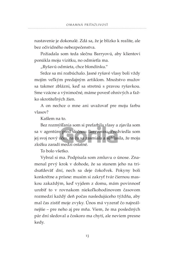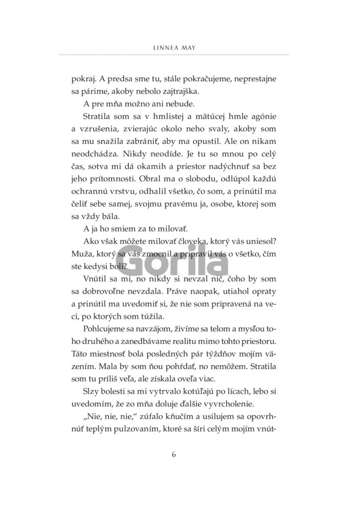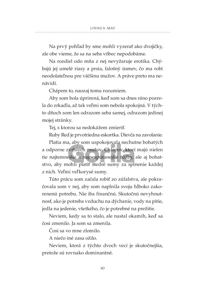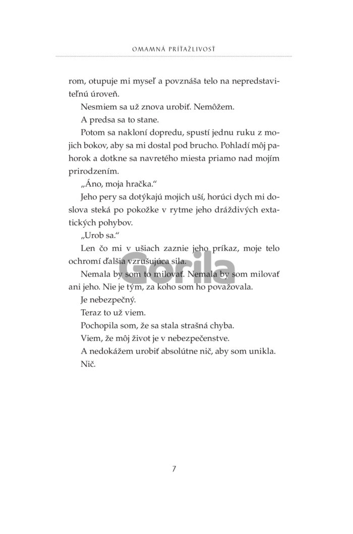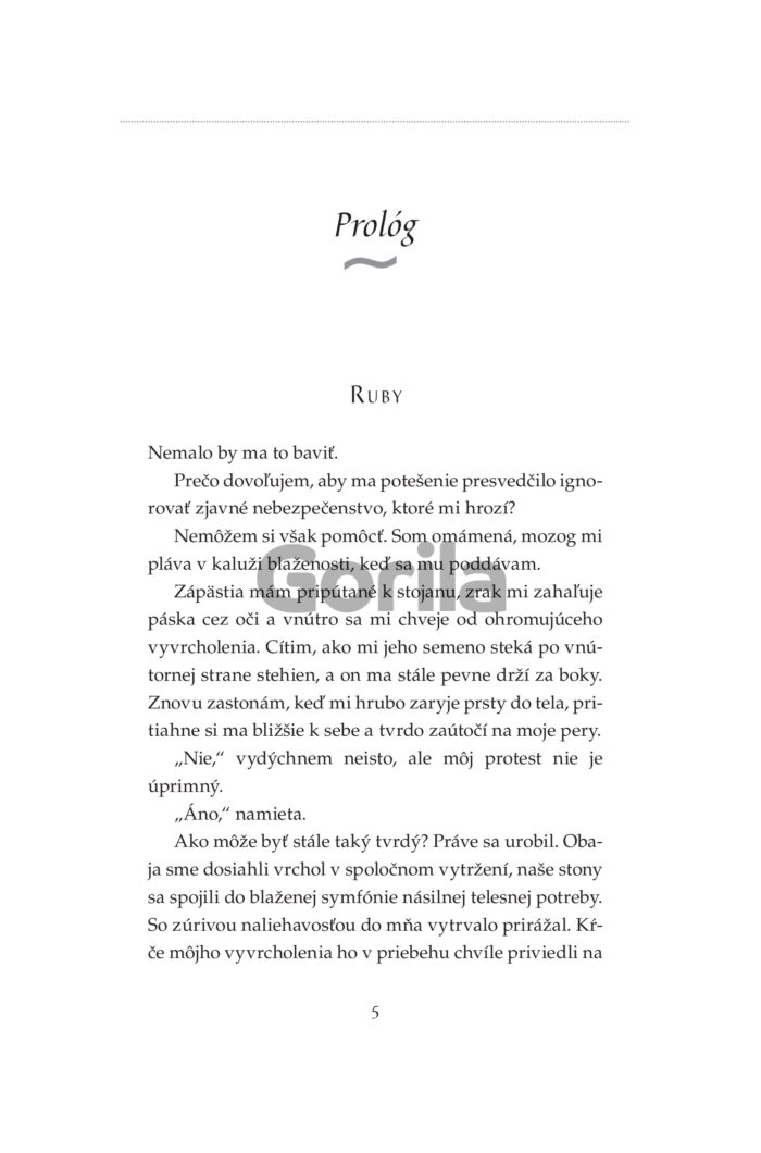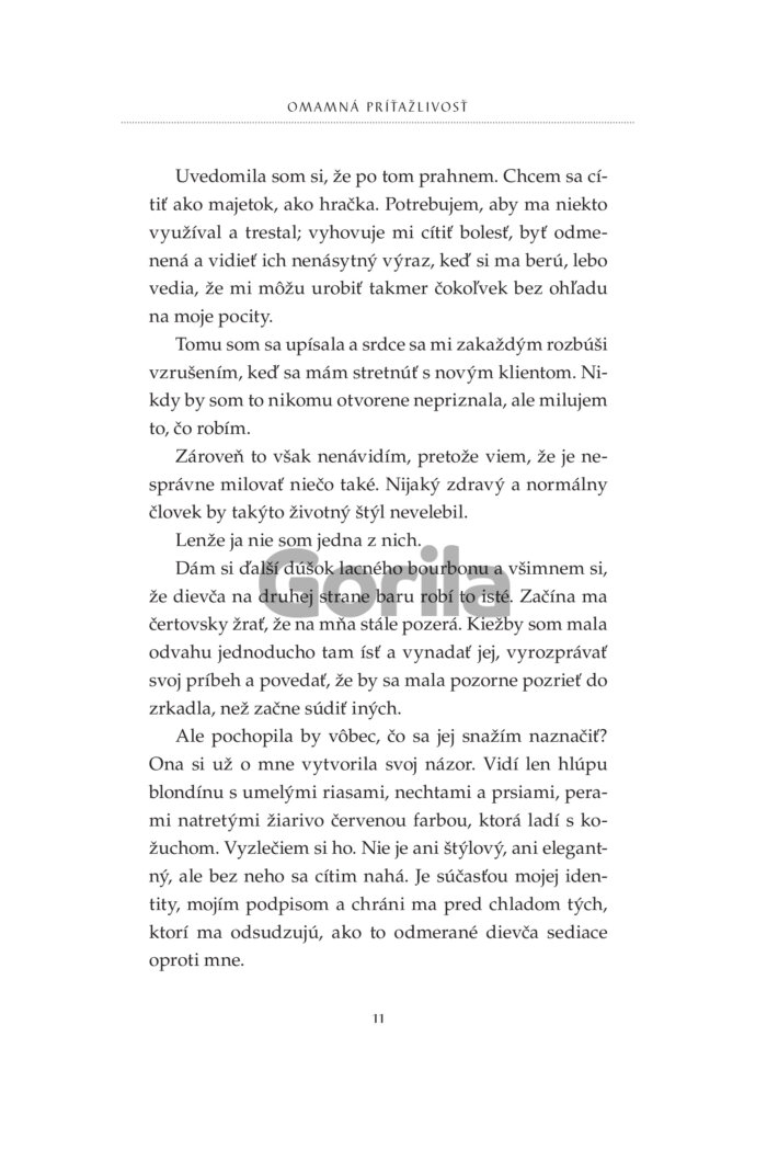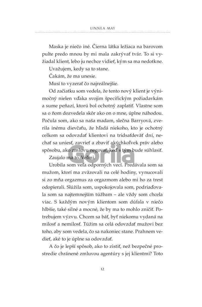S peniazmi a výzorom, ktorému ženy nedokážu odolať, je ľahké dostať ich, kam chcem. V skutočnosti nevedia, čo ma vzrušuje. Až na tie, ktorým za to platím. Za možnosť prenasledovať ich a loviť ako vlk bezbranné jahniatka. No ich strach je len hraný a nedokáže ma zasýtiť. Skutočné uchvátenie sa nedá predstierať. Potrebujem niekoho výnimočného, kto nehrá žiadnu rolu. Niekoho ako ju. Už dávno som si všimol jej lákavé krivky a podmanivý pohľad. Ešte o tom nevie, ale bude mi patriť. Ako moja zajatkyňa, ktorú naučím oddanosti a pravej rozkoši. Nakoniec možno nie je taká nevinná a jej duša je rovnako skazená ako moja. Možno mi oveľa viac vezme, ako jej ja dám.
