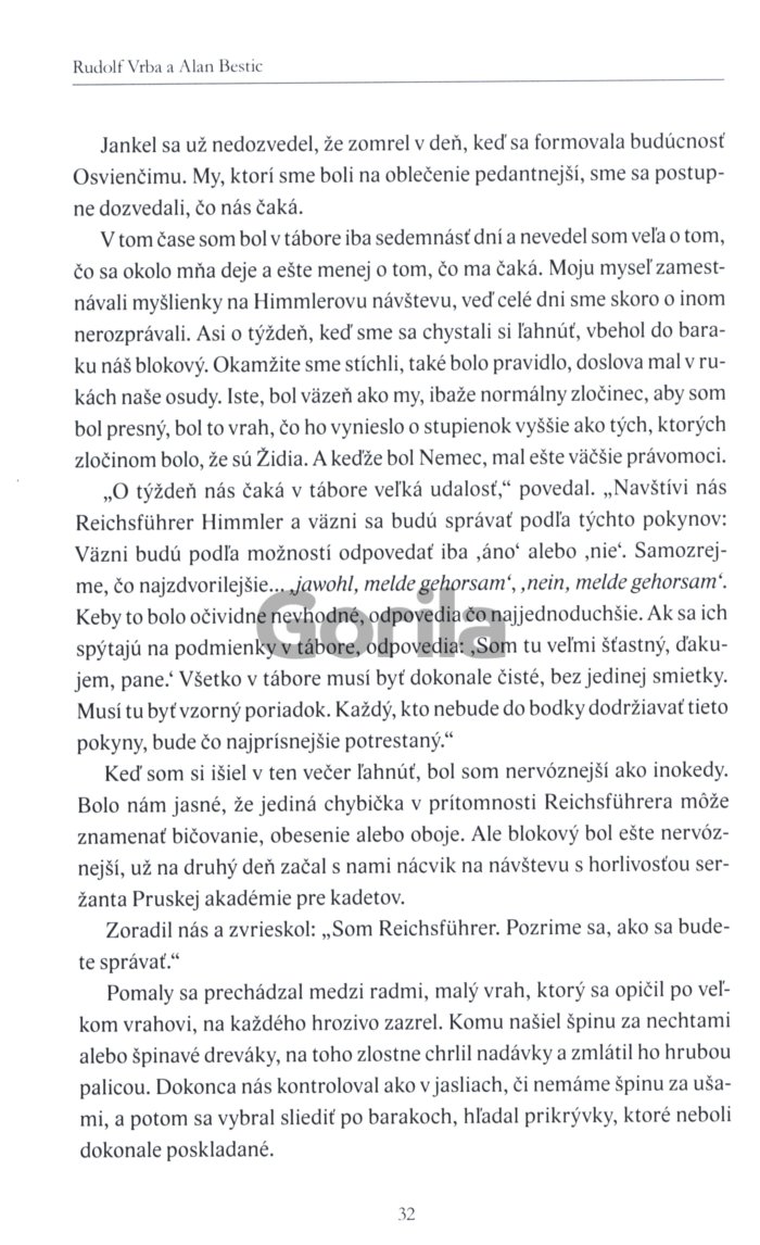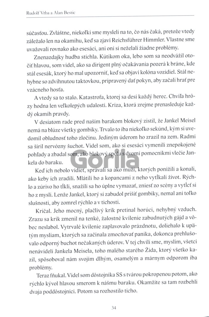 Knihu Rudolfa Vrbu, ktorú poznajú čitatelia v mnohých krajinách, možno čítať rôznymi spôsobmi. Ako strhujúci príbeh plný nečakaných zvratov a stretnutí. Ako správu o vzniku a osude jedného z najzávažnejších dokumentov druhej svetovej vojny. Ako svedectvo o vyhladzovacích táboroch. Ako spoveď človeka, ktorý má silu otvorene hovoriť o veciach, o ktorých sa niekedy hovoriť nedá. Ako dobrodružnú správu o jednom z veľkých útekov histórie. Ako rozprávanie o mladom mužovi, ktorý vzdoroval nespravodlivému osudu, koľkokrát za neľudských podmienok, a pritom si dokázal zachovať svoju tvár.