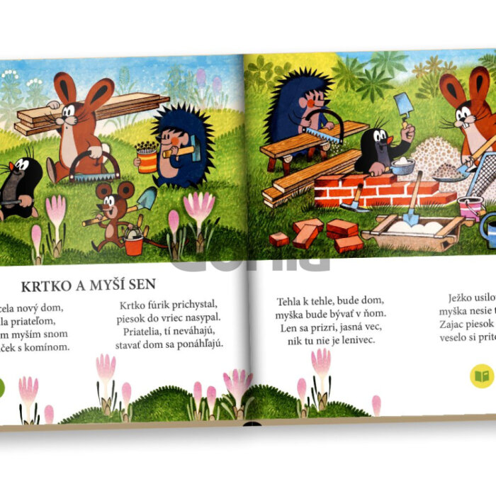 Nádherné známe ilustrácie Zdeňka Milera zavedú deti za krtkom a jeho kamarátmi. Najprv krtko pomôže so stavbou nového domčeka, ktorý si vysnívala myška, potom zachráni strateného zajačika a nakoniec sa vydá na výlet, kde ho prekvapia medvede. Krtko je skrátka kamarát, s ktorým rozhodne nie je nuda.