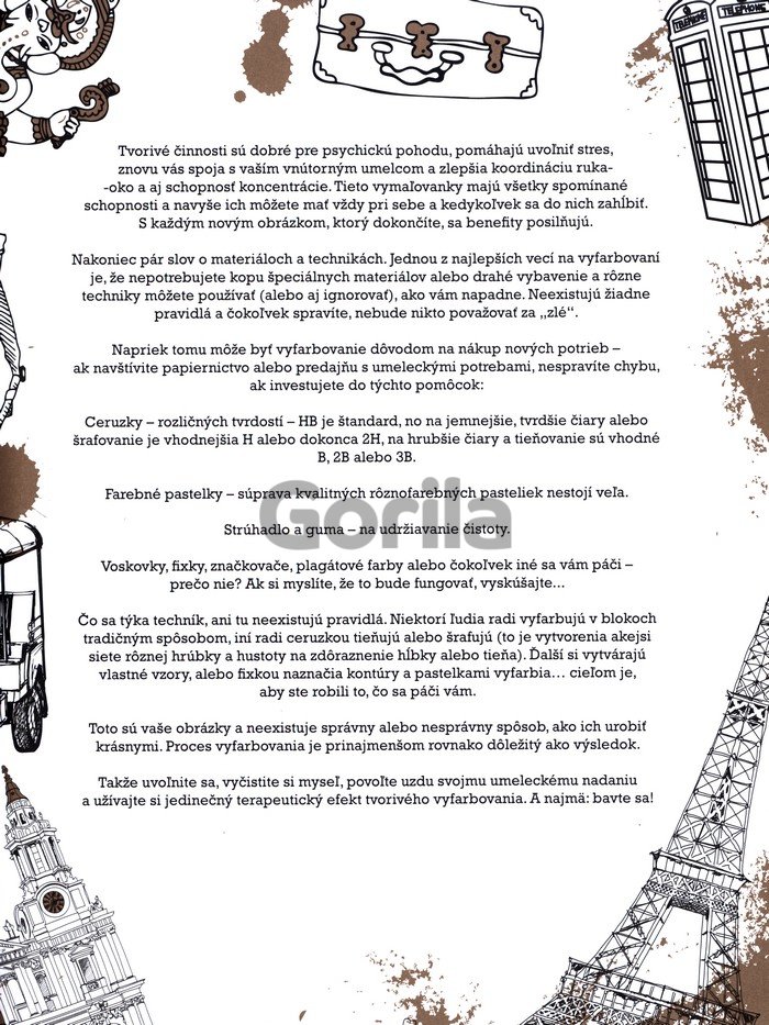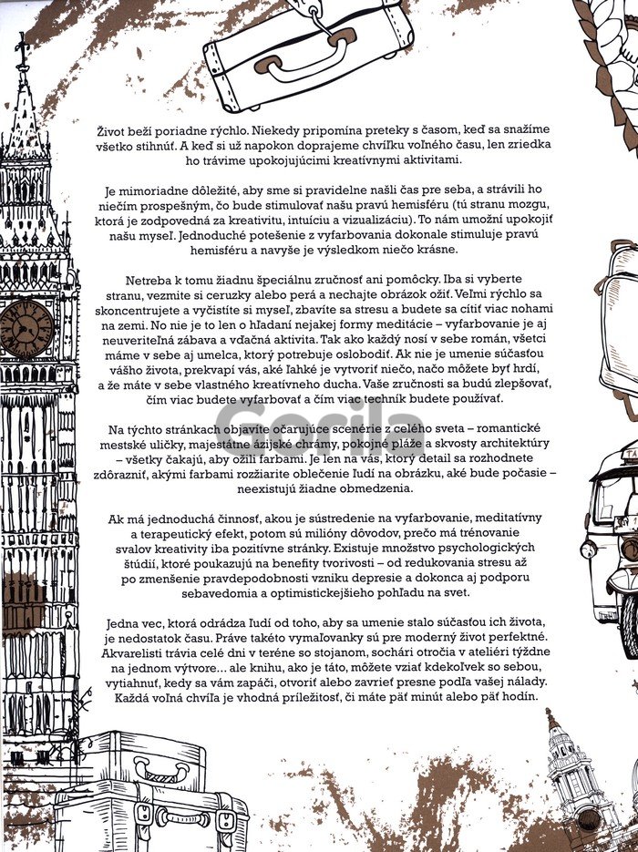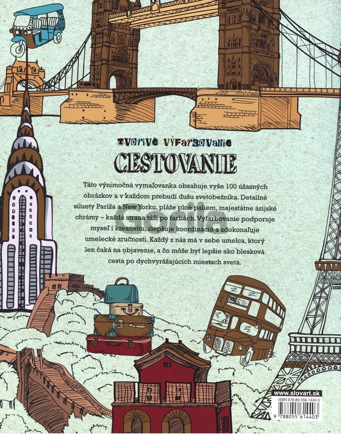 Táto výnimočná vymaľovanka obsahuje vyše 100 úžasných obrázkov a v každom prebudí dušu svetobežníka. Detailné siluety Paríža a New Yorku, pláže plné paliem, majestátne ázijské chrámy – každá strana túži po farbách. Vyfarbovanie podporuje myseľ i kreativitu, zlepšuje koordináciu a zdokonaľuje umelecké zručnosti. Každý z nás má v sebe umelca, ktorý len čaká na objavenie, a čo môže byť lepšie ako blesková cesta po dychvyrážajúcich miestach sveta.