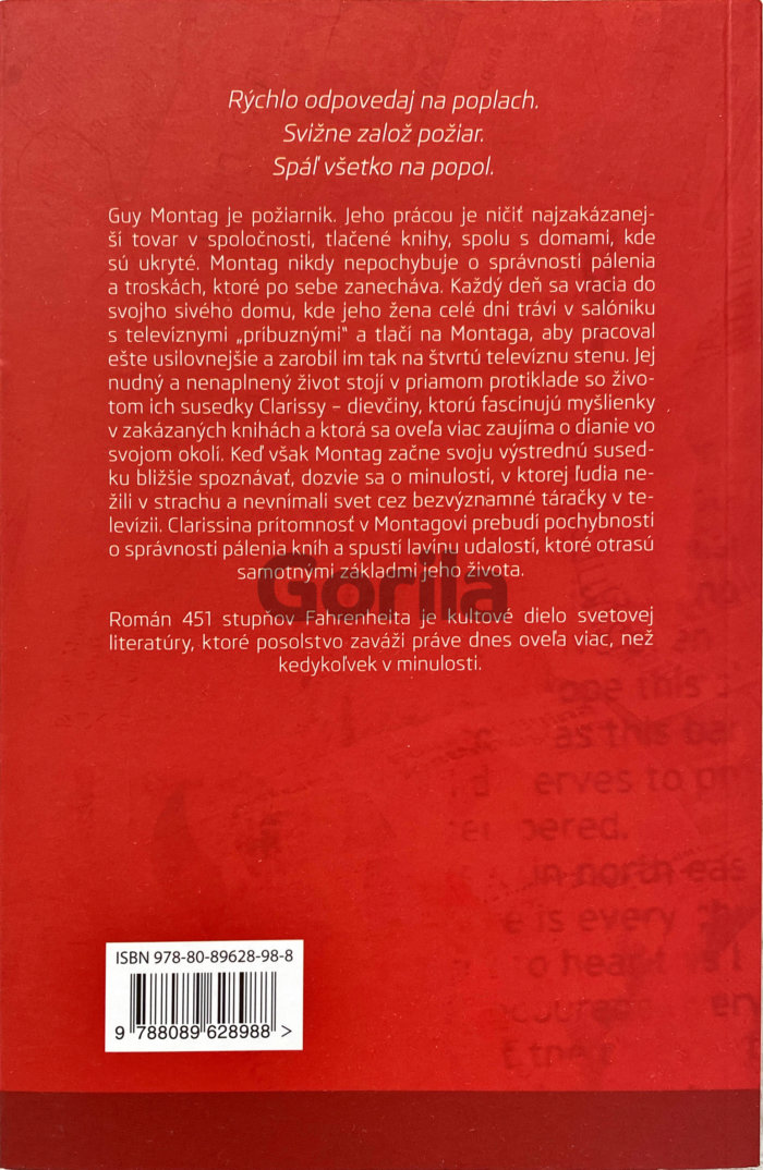 Guy Montag je požiarnik. Jeho prácou je ničiť najzakázanejší tovar v spoločnosti, tlačené knihy, spolu s domami, kde sú ukryté. Montag nikdy nepochybuje o správnosti pálenia a troskách, ktoré po sebe zanecháva. Každý deň sa vracia do svojho sivého domu, kde jeho žena celé dni trávi v salóniku s televíznymi „príbuznými“ a tlačí na Montaga, aby pracoval ešte usilovnejšie a zarobil im tak na štvrtú televíznu stenu. Jej nudný a nenaplnený život stojí v priamom protiklade so životom ich susedky Clarissy – dievčiny, ktorú fascinujú myšlienky v zakázaných knihách a ktorá sa oveľa viac zaujíma o dianie vo svojom okolí. Keď však Montag začne svoju výstrednú susedku bližšie spoznávať, dozvie sa o minulosti, v ktorej ľudia nežili v strachu a nevnímali svet cez bezvýznamné táračky v televízii. Clarissina prítomnosť v Montagovi prebudí pochybnosti o správnosti pálenia kníh a spustí lavínu udalostí, ktoré otrasú samotnými základmi jeho života. Román 451 stupňov Fahrenheita je kultové dielo svetovej literatúry, ktoré posolstvo zaváži práve dnes oveľa viac, než kedykoľvek v minulosti.