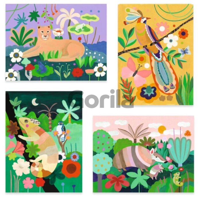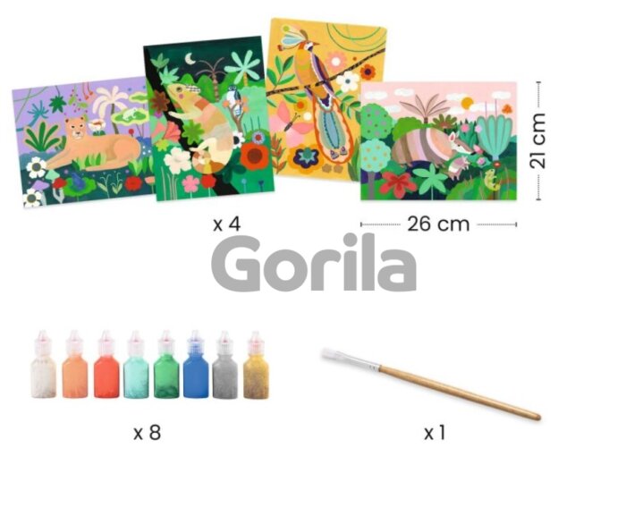 Obsah: 4 ilustrované desky k dokončení (21 x 28 cm), 8 perleťových barev, 1 štětec a 1 barevná brožurka s pokyny krok za krokem.