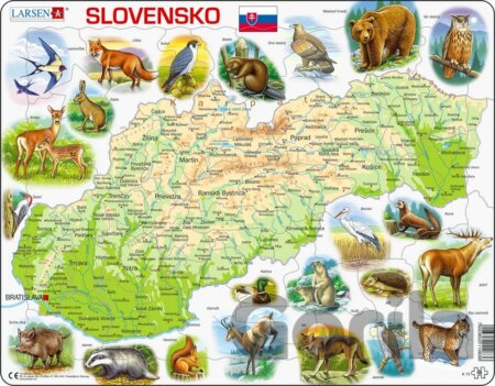 Mapa Slovenska zobrazuje rieky, pohoria, nížiny a ich názvy, ako aj názvy štítov, miest a obcí. Po okolí ju lemujú zvieratá žijúce v slovenskej prírode.