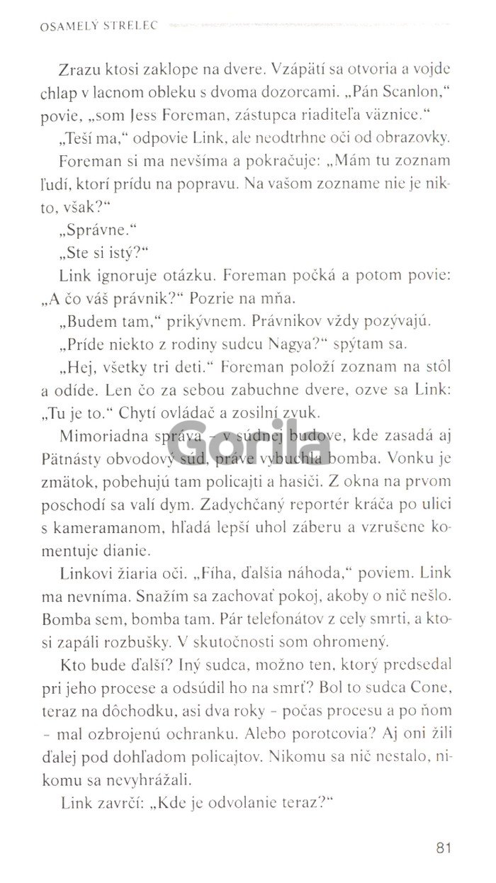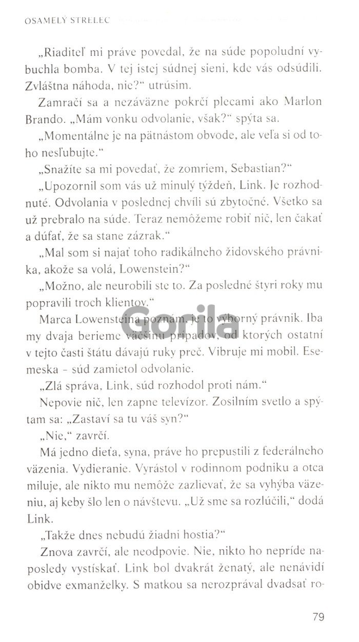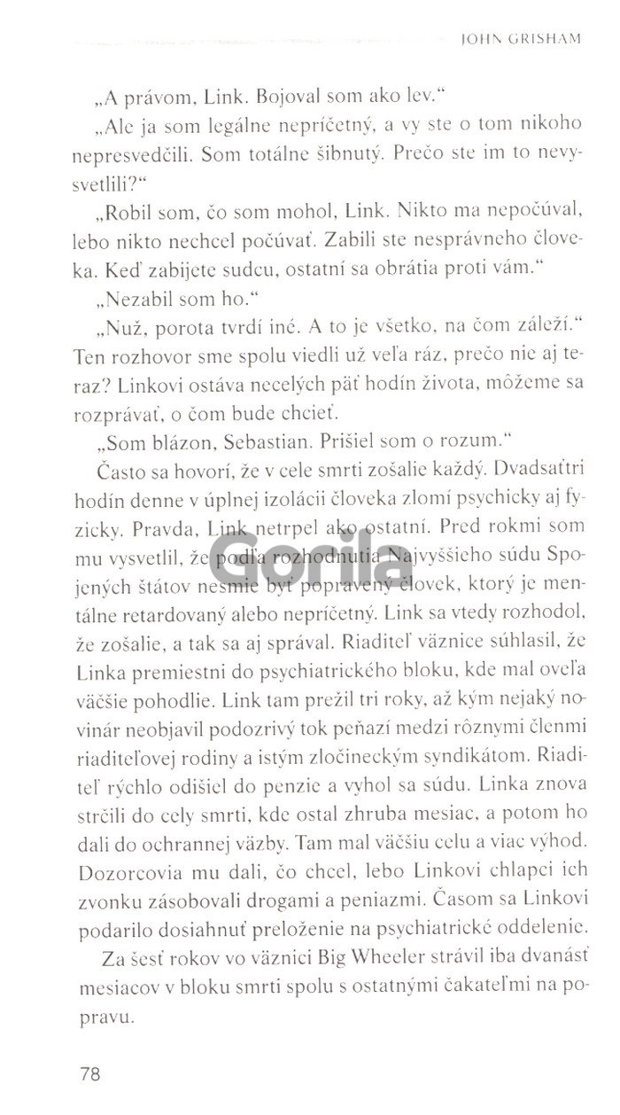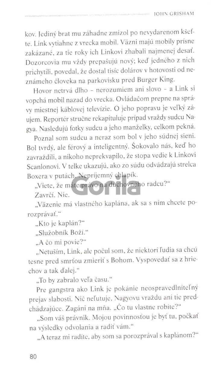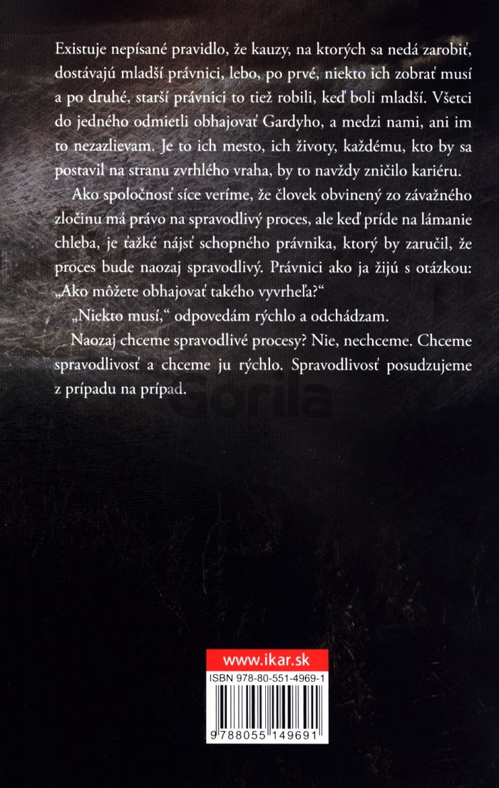 Existuje nepísané pravidlo, že kauzy, na ktorých sa nedá zarobiť, dostávajú mladší právnici, lebo po prvé, niekto ich zobrať musí a po druhé, starší právnici to tiež robili, keď boli mladší. Všetci do jedného odmietli obhajovať Gardyho, a medzi nami, ani im to nezazlievam. Je to ich mesto, ich životy, každému, kto by sa postavil na stranu zvrhlého vraha, by to navždy zničilo kariéru.