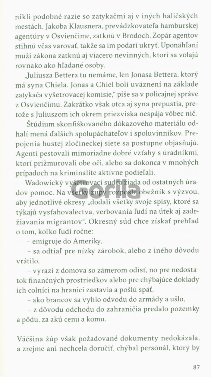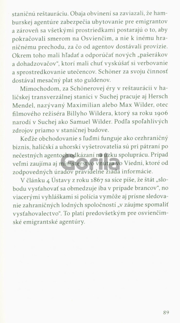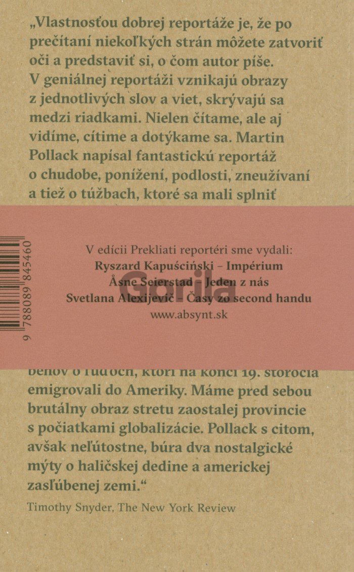 „Vlastnosťou dobrejreportáže je, že po prečítaní niekoľkých strán môžete zatvoriť oči a predstaviť si, o čom autor píše. V geniálnej reportáži vznikajú obrazy z jednotlivých slov a viet, skrývajú sa medzi riadkami. Nielen čítame, ale aj vidíme, cítime a dotýkame sa. Martin Pollack napísal fantastickú reportáž o chudobe, ponížení, podlosti, zneužívaní a tiež o túžbach, ktorésa mali splniť v Amerike. Vďaka jeho literárnemu umeniu si vieme predstaviť, ako páchla haličská chudoba – rovnaká pre Slovákov, Poliakov, Rusínov i Židov. Ďakujme Bohu za privilégium života v inej dobe.“