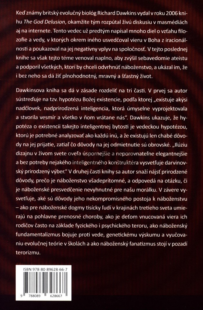 Keď známy britský evolučný biológ Richard Dawkins vydal v roku 2006 knihu The God Delusion, okamžite tým rozpútal živú diskusiu v masmédiách aj na internete. Tento vedec už predtým napísal mnoho diel o vzťahu filozofie a vedy, v ktorých okrem iného usvedčoval vieru v B oha z iracionálnosti a poukazoval na jej negatívny vplyv na spoločnosť. V tejto poslednej knihe sa však tejto téme venoval naplno, aby zvýšil sebavedomie ateistu a podporil všetkých, ktorí by chceli odvrhnúť náboženstvo, a ukázal im, že i bez neho sa dá žiť plnohodnotný, mravný a šťastný život. Dawkinsova kniha sa dá v zásade rozdeliť na tri časti. V prvej sa autor sústreďuje na tzv. hypotézu Božej existencie, podľa ktorej „existuje akýsi nadčlovek, nadprirodzená inteligencia, ktorá úmyselne vyprojektovala a stvorila vesmír a všetko v ňom, vrátane nás“. Dawkins ukazuje, že hypotéza o existencii takejto inteligentnej bytosti je vedeckou hypotézou, ktorú je potrebné analyzovať ako každú inú, a že existujú len chabé dôvody pre jej prijatie, zatiaľ čo dôvody na jej odmietnutie sú obrovské. „Ilúziu dizajnu v živom svete oveľa úspornejšie a neporovnateľne elegantnejšie a bez potreby nejakého inteligentného konštruktéra vysvetľuje darvinovský prirodzený výber.“ V druhej časti knihy sa autor snaží nájsť prirodzené dôvody, prečo je náboženstvo všadeprítomné, a či je náboženské presvedčenie nevyhnutné pre našu morálku. V závere potom vysvetľuje, aké sú jeho dôvody pre nekompromisný postoj k náboženstvu – ako pre náboženské dogmy umierajú tisícky ľudí v krajinách tretieho sveta na pohlavne prenosné choroby, ako je deťom vnucovaná viera ich rodičov často krát na základe fyzického i psychického teroru, ako náboženský fundamentalizmus bojuje proti vede, genetickému výskumu a vyučovaniu evolučnej teórie na školách a ako náboženský fanatizmus stojí v pozadí terorizmu.