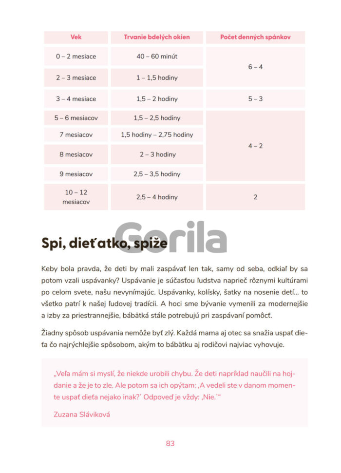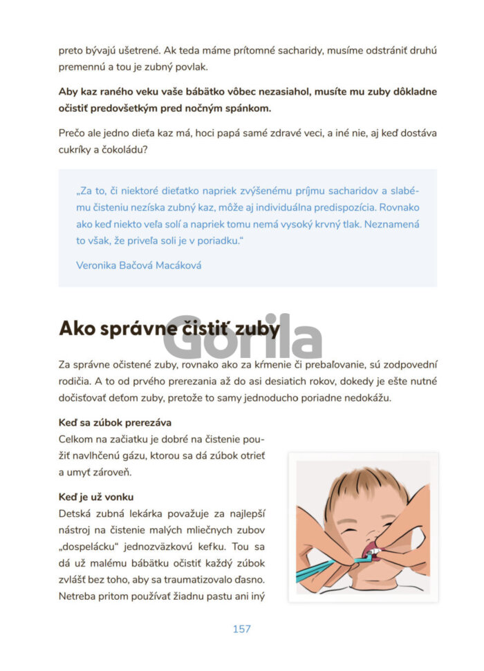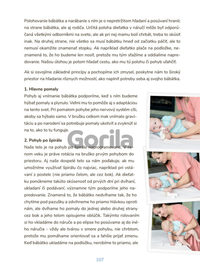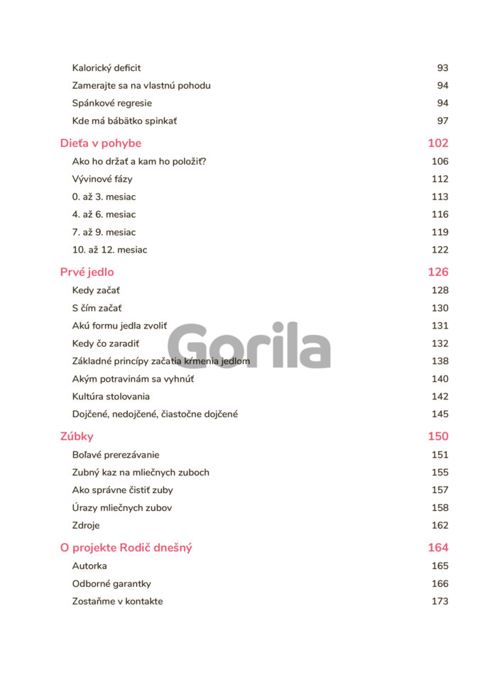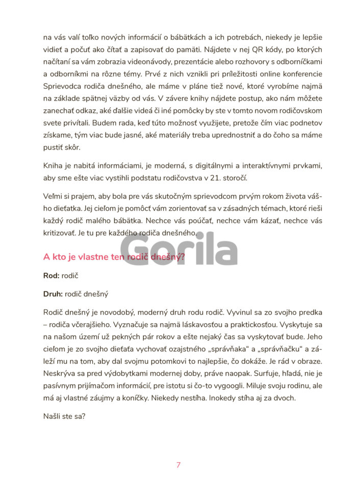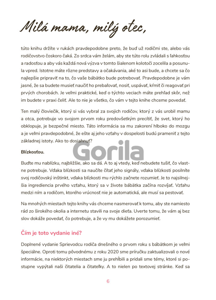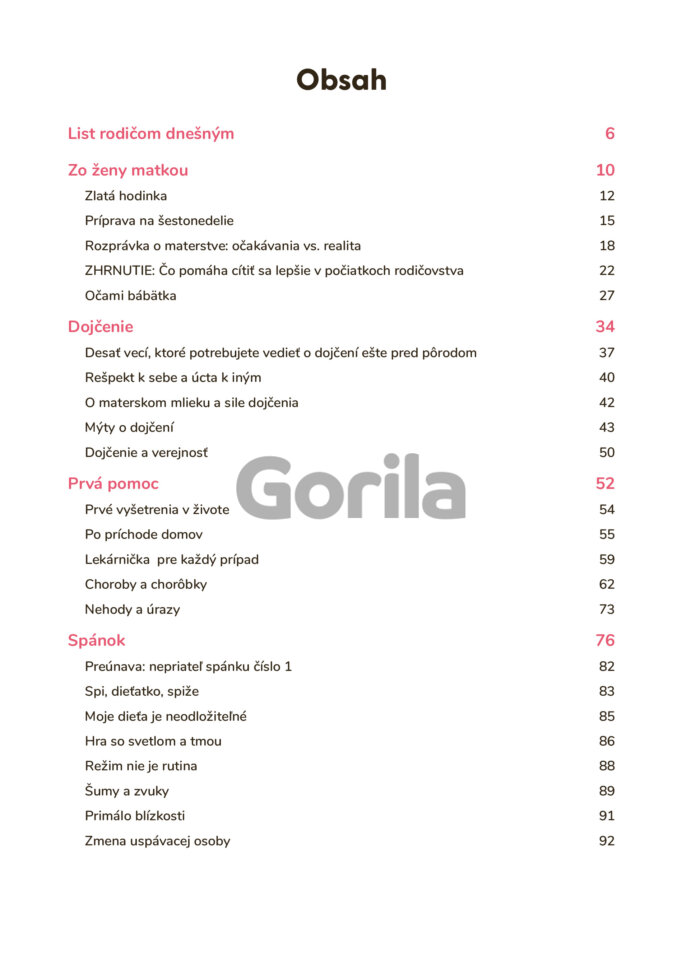 Kniha je tvorená na mieru rodičovi dnešnému – novodobému druhu rodiča, ktorý sa vyznačuje najmä láskavosťou a praktickosťou. Potrebuje sa zorientovať v spleti rád z okolia a informácií na internete. Na pomoc mu prichádzajú odborníčky a odborníci, ktorí ho prevedú témami od šestonedelia, dojčenia, cez starostlivosť o bábätko, prvé choroby, spánok, pohybový vývin až po príkrmy a prvé zúbky.