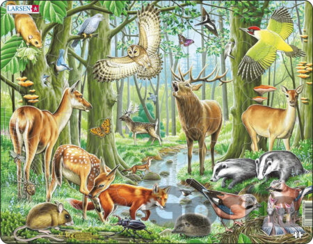 Obrázek ze života zvířat v evropském lese.Jelen,laň kolouškem,liška,ježek, sova a další. Poznáš je všechny?