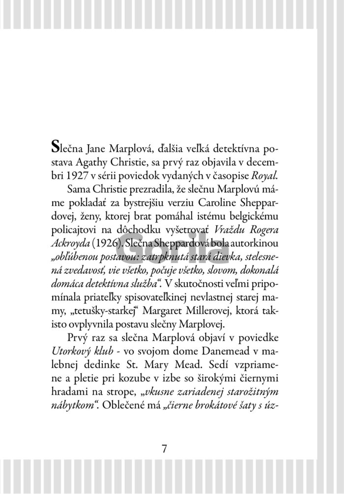 Zábavná i poučná knižka výrokov najslávnejšej amatérskej detektívky všetkých čias obsahuje aj zaujímavú esej o Jane Marplovej i nemenej zaujímavý článok o ženskom inštinkte z pera legendárnej spisovateľky.
