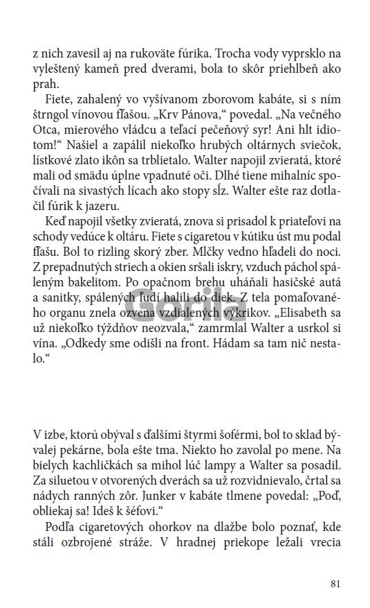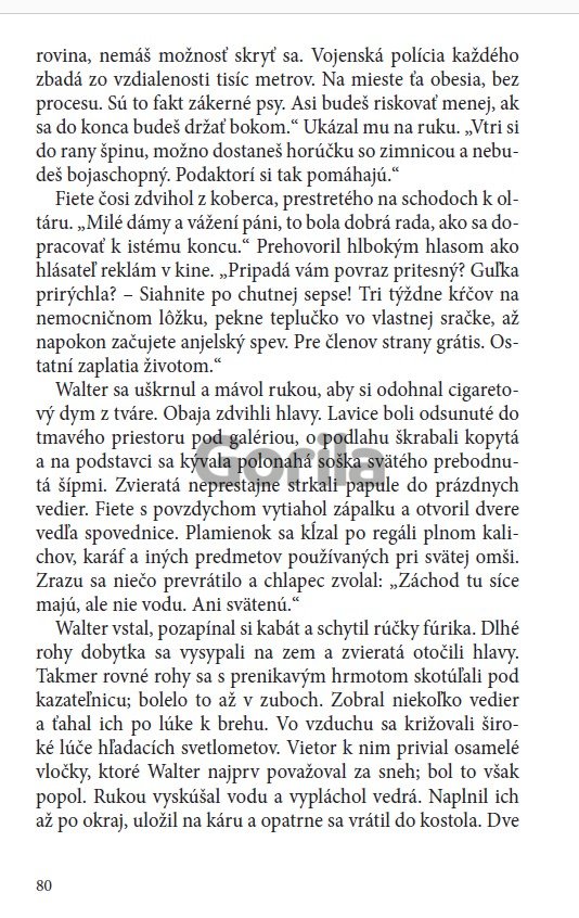Odhodil ohorok, znova sa napil. Cez mreže prúdil dnu jemný vodný prach. Walter utľapkal okolo knôtu roztečený, takmer stuhnutý stearín. „A ako je to,“ spustil duto a odkašľal si, aby opäť získal svoj hlas, „ako je to s človekom, ktorý musí strieľať? Čo ten prenesie na svojich potomkov?“