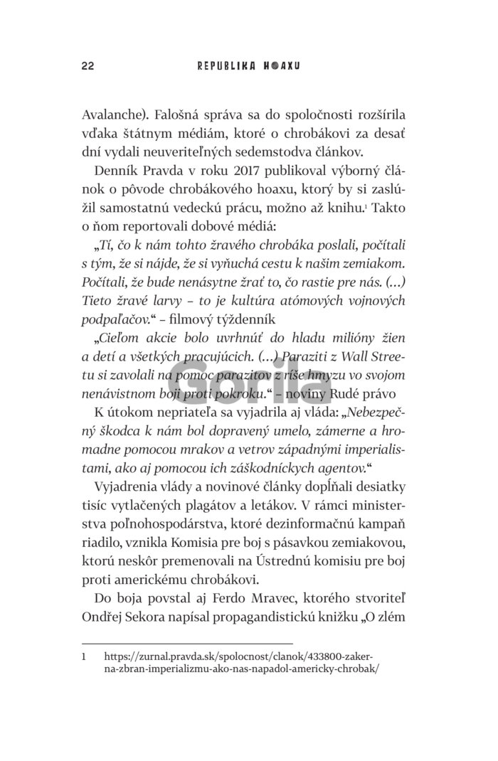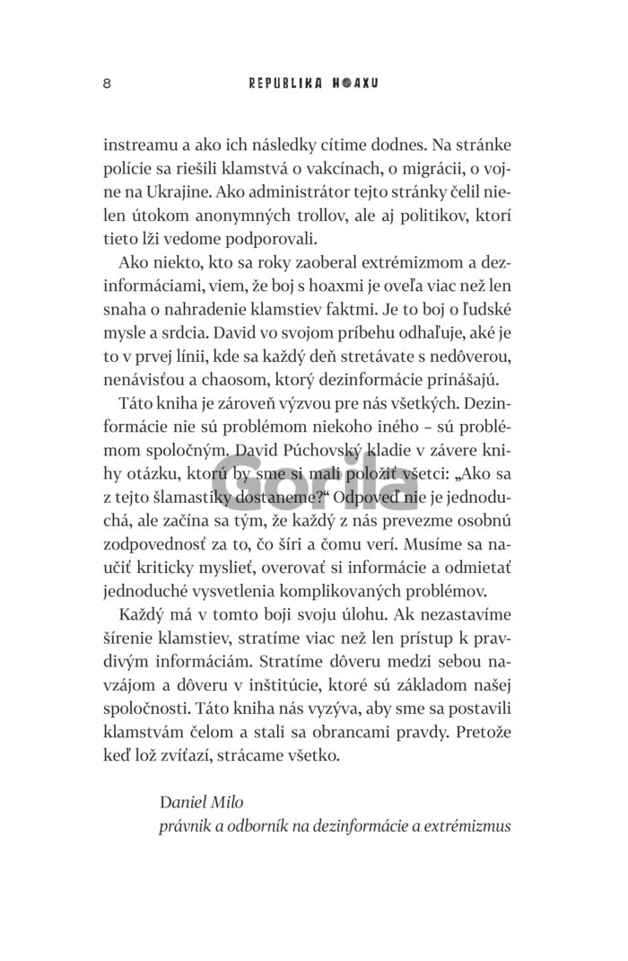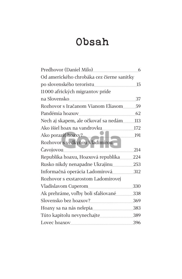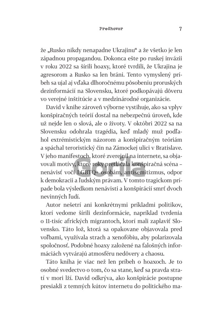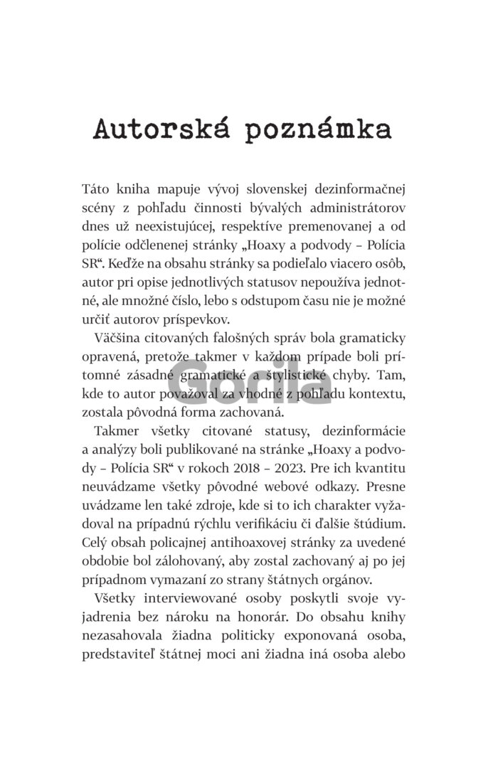 David Púchovský, bývalý príslušník Policajného zboru, bol sedem rokov v prvej línii boja proti falošným správam. Pamätá si relatívne pokojné obdobie sveta sociálnych sietí, ktorého idylka sa rozplynula vypuknutím pandémie. Situácia eskalovala začiatkom ruskej vojny na Ukrajine a v tomto trende pokračuje dodnes. Autor vo svojej novej knihe mapuje časom overené dezinformácie, ktoré sa stali takmer súčasťou slovenského kultúrneho dedičstva, pripomína tie najslávnejšie z posledných rokov a snaží sa získať odpoveď na otázku, prečo sa zo Slovenska stala republika hoaxu a čo s tým môžeme urobiť.