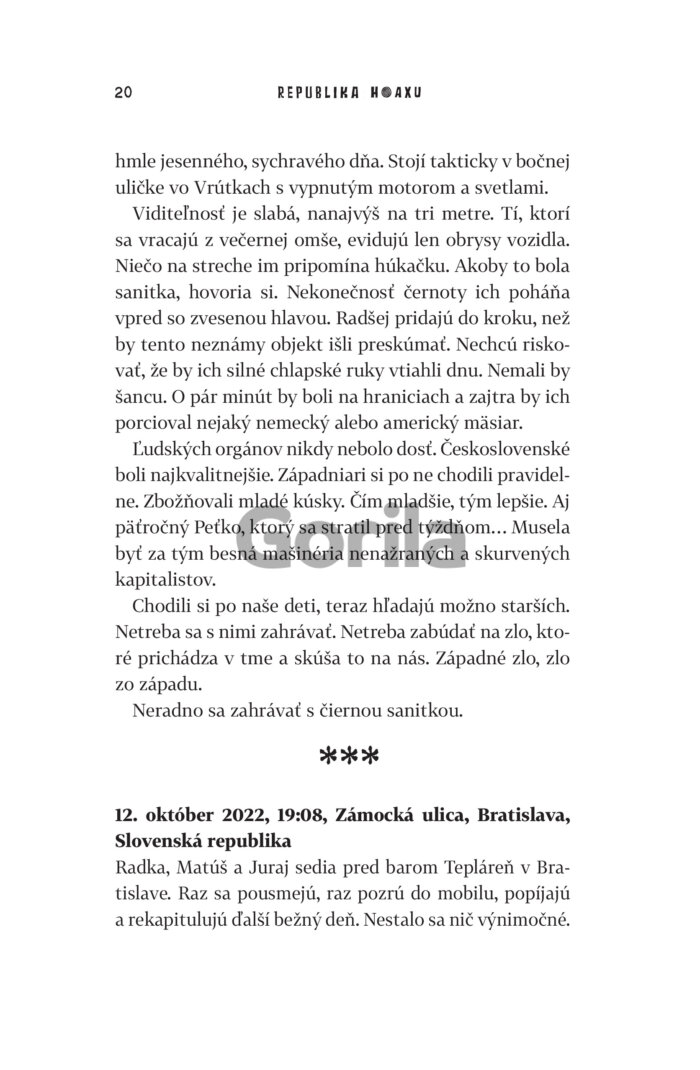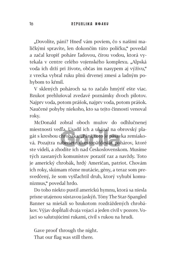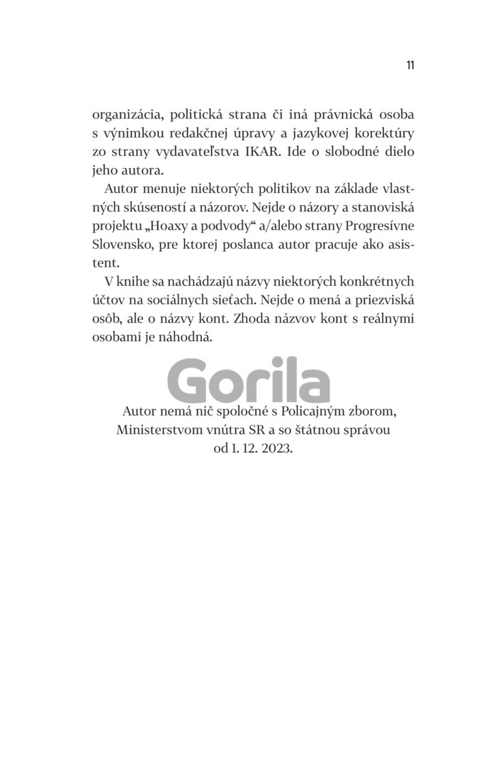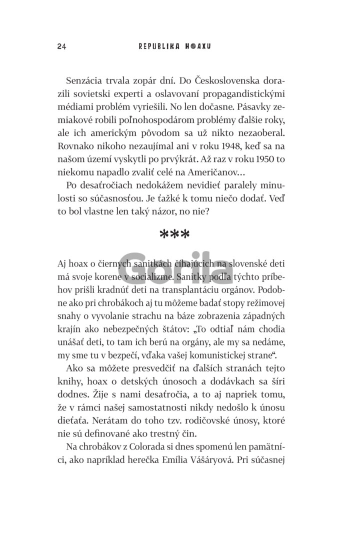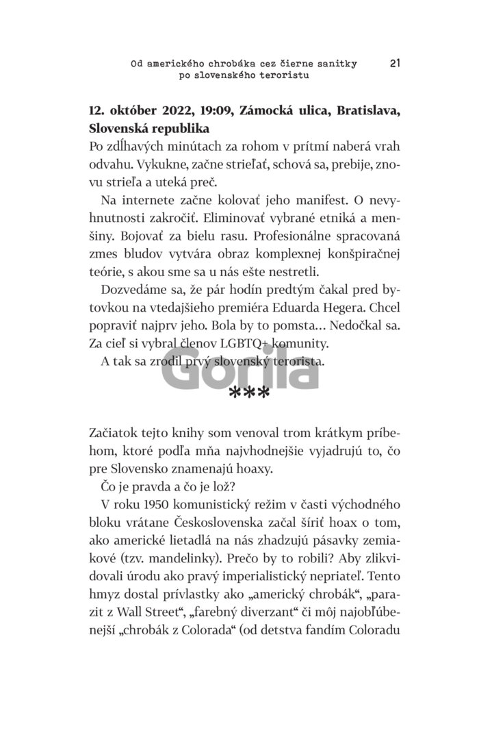 David Púchovský, bývalý príslušník Policajného zboru, bol sedem rokov v prvej línii boja proti falošným správam. Pamätá si relatívne pokojné obdobie sveta sociálnych sietí, ktorého idylka sa rozplynula vypuknutím pandémie. Situácia eskalovala začiatkom ruskej vojny na Ukrajine a v tomto trende pokračuje dodnes. Autor vo svojej novej knihe mapuje časom overené dezinformácie, ktoré sa stali takmer súčasťou slovenského kultúrneho dedičstva, pripomína tie najslávnejšie z posledných rokov a snaží sa získať odpoveď na otázku, prečo sa zo Slovenska stala republika hoaxu a čo s tým môžeme urobiť.