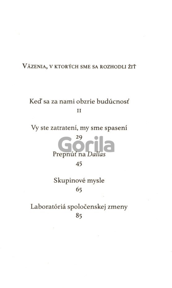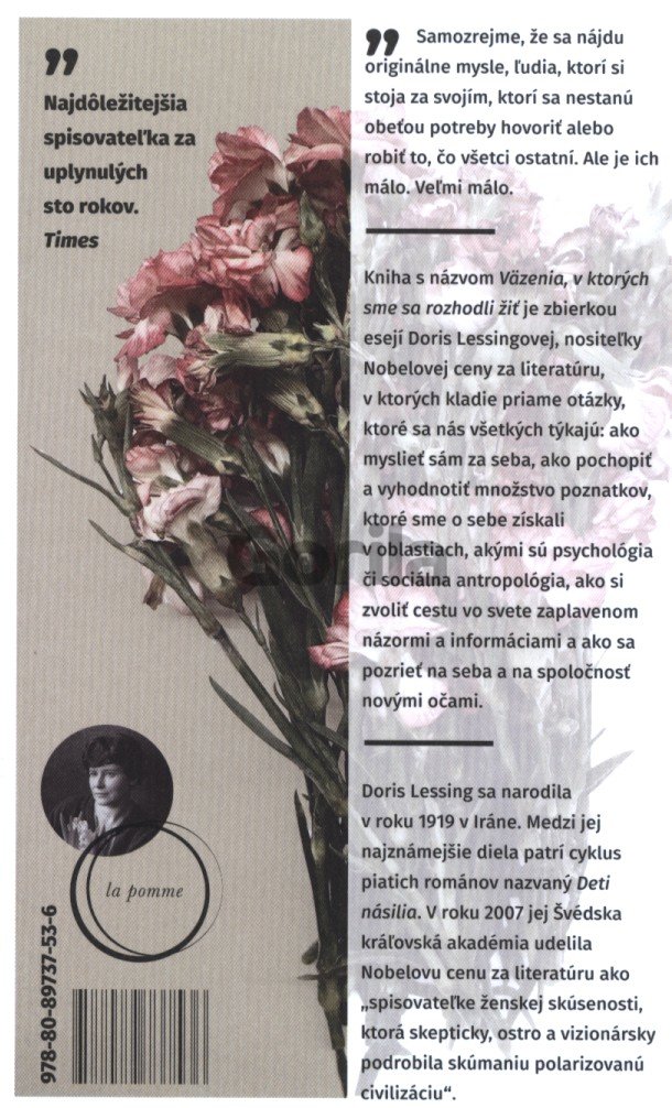 Kniha s názvom Väzenia, v ktorých sme sa rozhodli žiť sú zbierkou prednášok Doris Lessingovej, nositeľky Nobelovej ceny za literatúru. V týchto výnimočných textoch sa zdôrazňuje význam nezávislého myslenia, spochybňovanie zaužívaných myšlienkových schém a vzorcov a odolávanie lákavej apatii. Doris Lessing tvrdí, že len, ak sme dostatočne slobodní na to, aby sme spochybnili autoritu a dovolili si nesúhlasiť, môžeme poraziť despotizmus a nevedomosť
