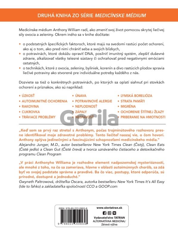 Medicínske médium Anthony William radí, ako zmeniť svoj život pomocou skrytej liečivej sily ovocia a zeleniny. Okrem iného sa v knihe dočítate: