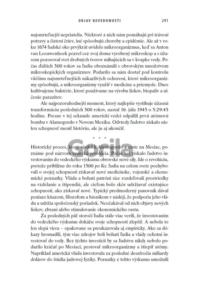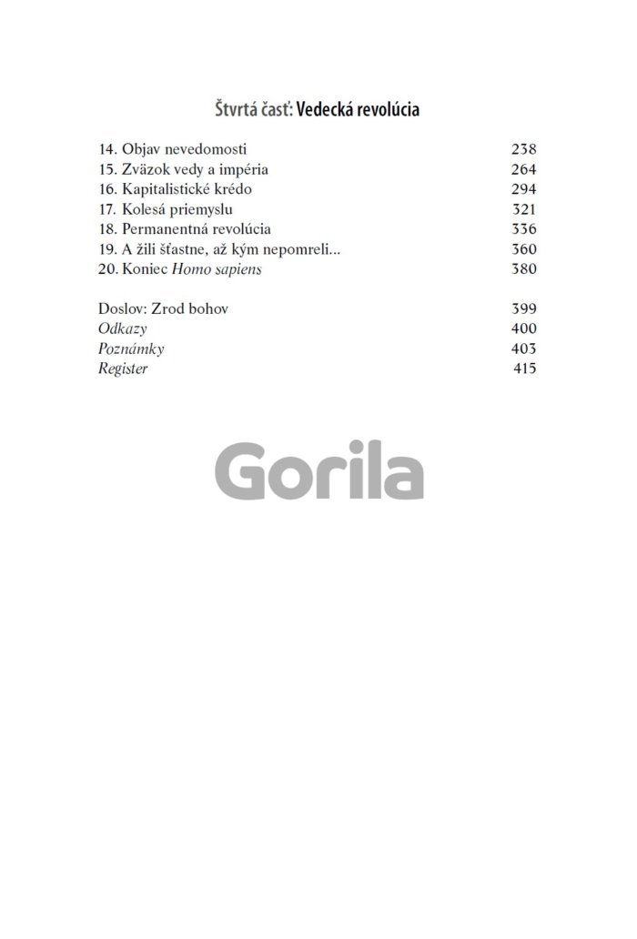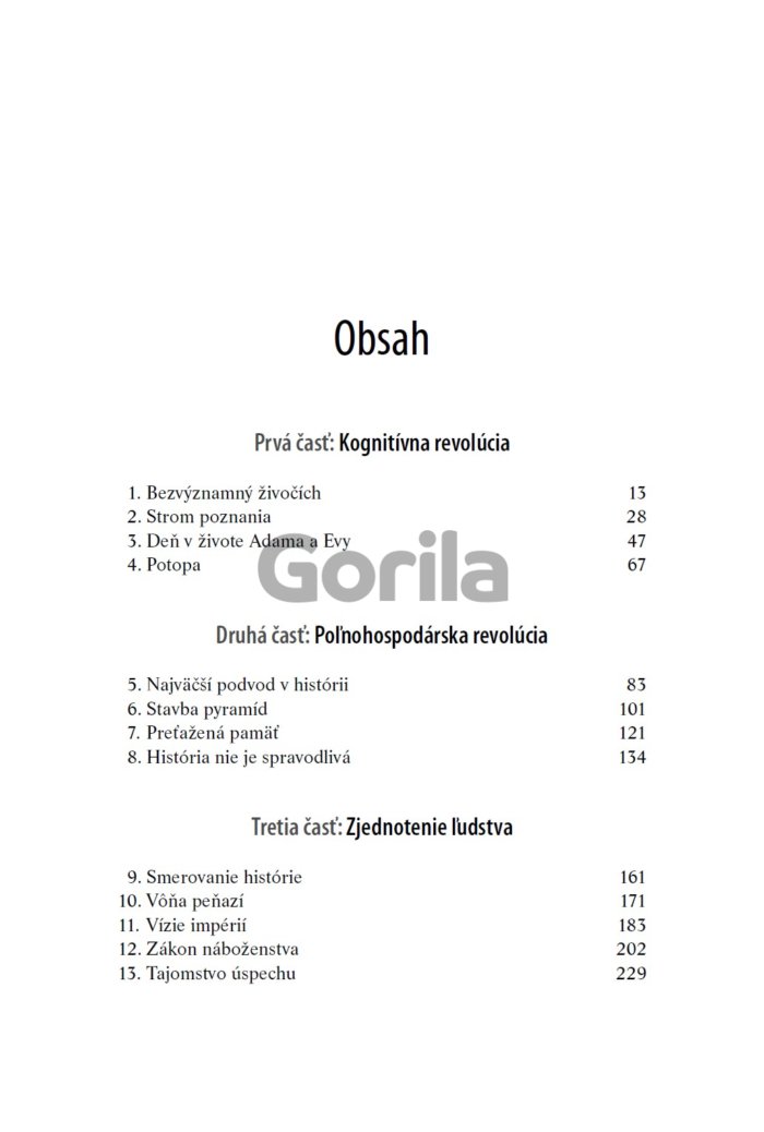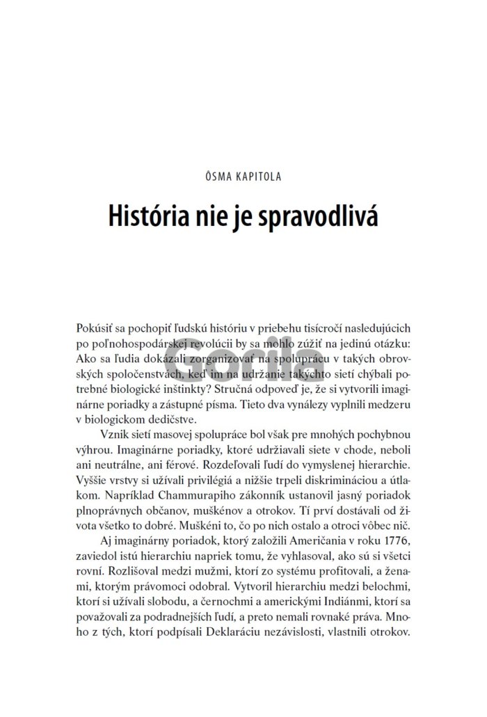 Kniha je vzrušujúcim zhrnutím našej neuveriteľnej histórie − od bezvýznamných opíc až k pánom sveta. Jej obsah je odvážny, obsiahly aj provokatívny. Spochybňuje všetko, čo sme o ľudstve zdanlivo vedeli: našu vieru, činy, moc... aj našu budúcnosť, a pritom sa zamýšľa a ozrejmuje najdôležitejšie otázky histórie a moderného sveta. Nestáva sa často, aby kniha dala čitateľom možnosť prehodnotiť prakticky všetko konanie človeka ako druhu. A presne to sa podarilo Hararimu v jeho zhrňujúcom, ale zrozumiteľnom pohľade na dejiny ľudstva.