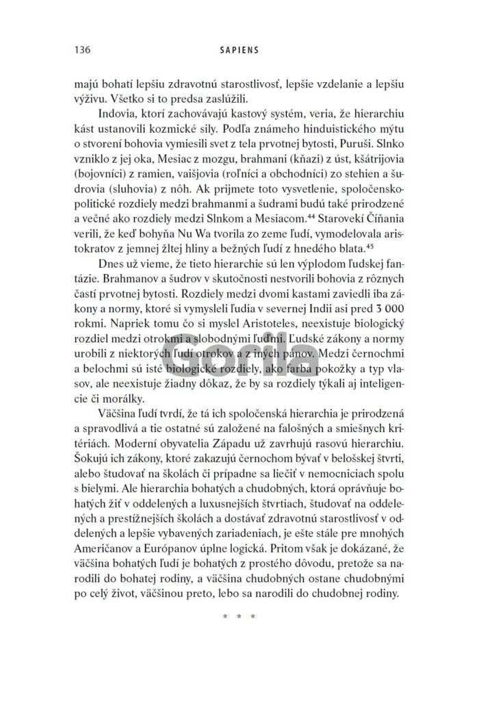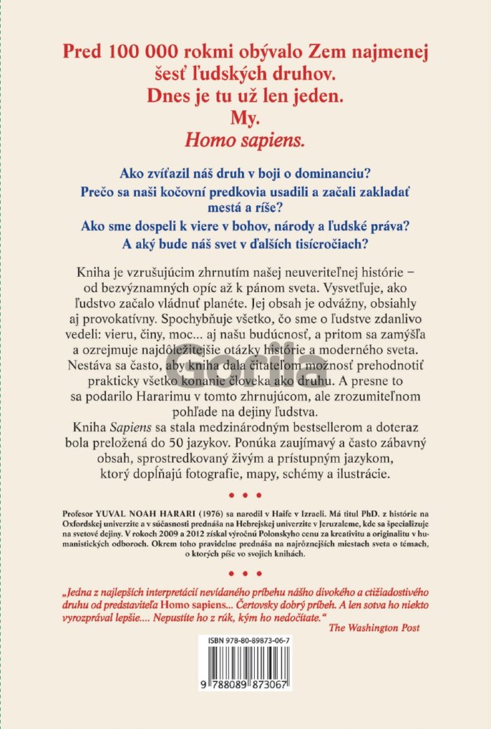 Harariho kniha Sapiens: Stručná história ľudstva sa stala medzinárodným bestsellerom a doteraz vyšla v tridsiatich piatich krajinách. Jej obsah je zaujímavý a často aj zábavný, je napísaná živým, prístupným jazykom a vlastný text dopĺňajú fotografie, mapy, schémy a ilustrácie.