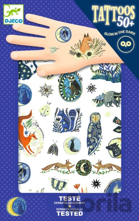 Tetovanie s nočnou tematikou s roztomilými zvieratkami. Pre radosť detí sa po zhasnutí svetiel objavia prekvapenia a malé detaily svietiace v tme! Tieto dočasné tetovania sú predrezané, takže sa ľahko používajú: stačí naniesť trochu vody. Dermatologicky testované.