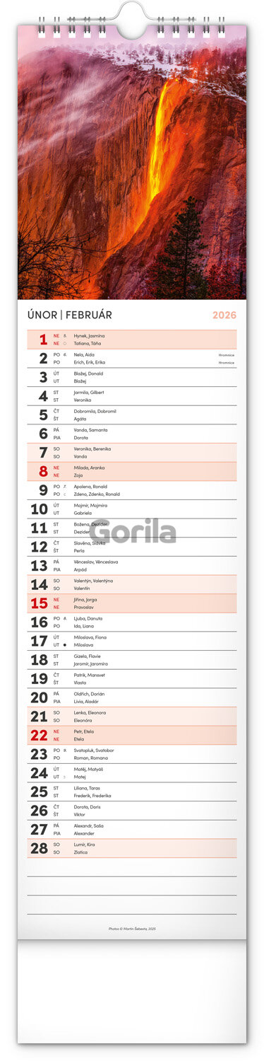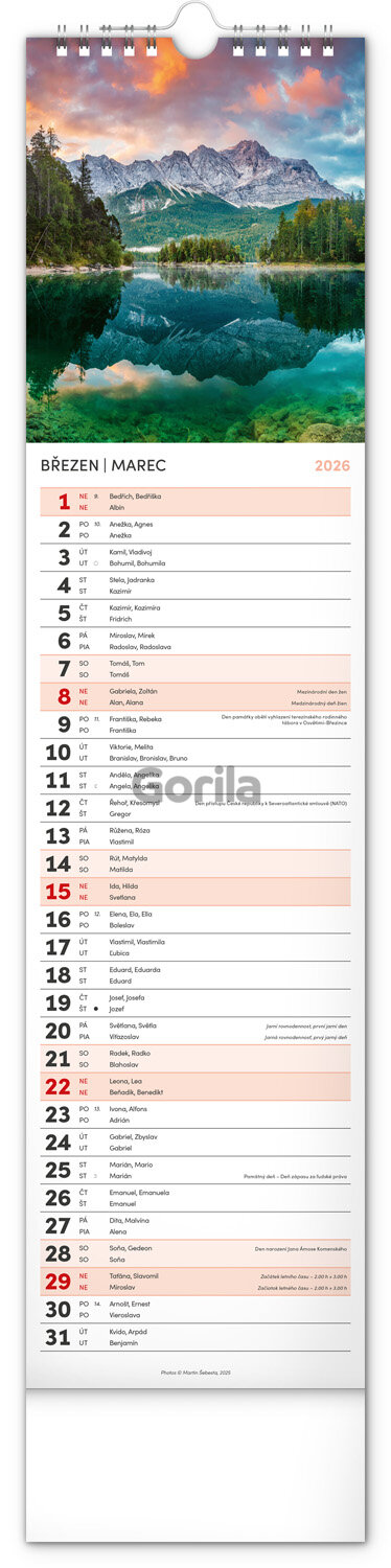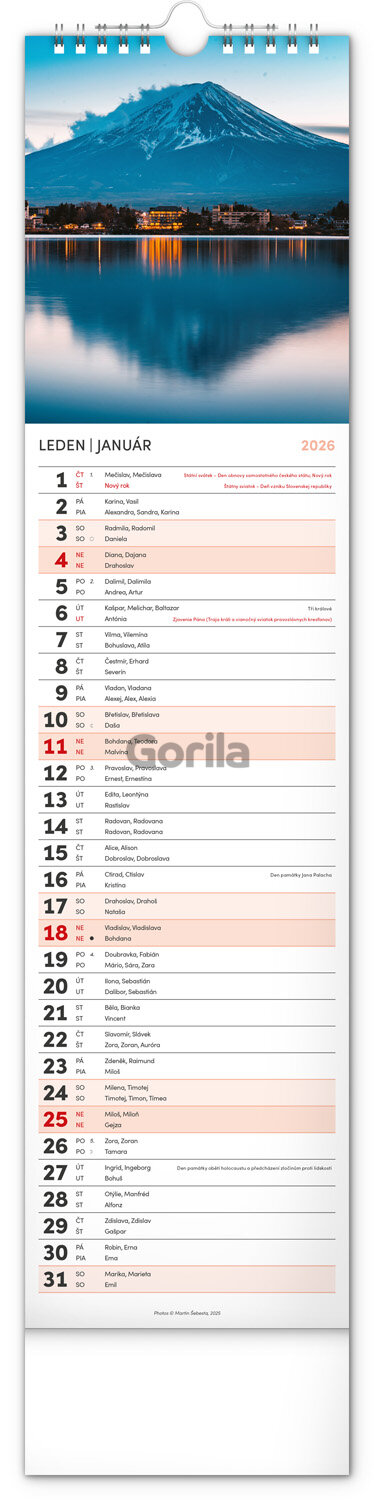 Urobte si radosť pohľadom na fotografie malebnej krajiny v praktickom úzkom formáte česko-slovenského nástenného kalendára. Kalendár obsahuje české a slovenské mená, sviatky, pamätné dni aj mesačné fázy. V každom jednotlivom dni je priestor pre poznámky.