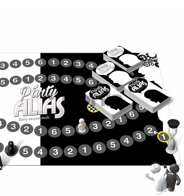 Hra Párty Alias Ženy verzus muži obsahuje: hrací plán, 400 kariet obsahujúcich 2 400 slov, presýpacie hodiny, 2 figúrky a pravidlá v slovenčine.