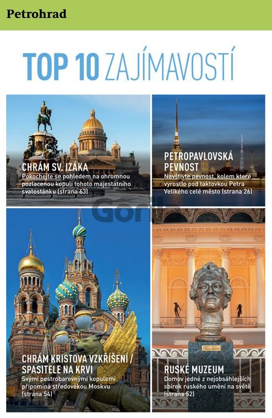 Petrohrad se rozkládá na mnoha ostrovech v síti kanálů a řek, přes které se klenou stovky mostů. Po době ústrků se pomalu probouzí do své někdejší krásy. Je to město paláců, jejichž pastelové fasády se odrážejí v hladkých hladinách kanálů, zámečky a kostely lemují zdejší náměstí a vznešené sochy mlčky shlíží na návštěvníky parků a zahrad. V Petrohradě najdete tolik historických a uměleckých muzeí, že je v podstatě nemožné projít je všechna i během několikadenního pobytu. Zažijte jedinečnou atmosféru Petrohradu. Nepropásněte zvedání mostů, navštivte Mariinské divadlo a vychutnejte si výbornou ruskou kuchyni. Budete zde mít řadu příležitostí zopakovat si azbuku a ruskou konverzaci. Pokud se ale v tomto jazyce necítíte jistě, vůbec nevadí. V turistických centrech se domluvíte také anglicky nebo německy a nebo si můžete přibalit ruskou konverzaci, třeba tu naši.