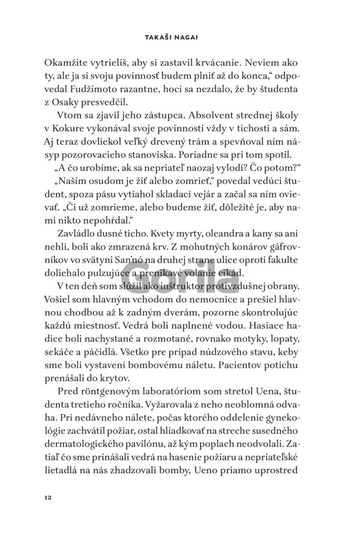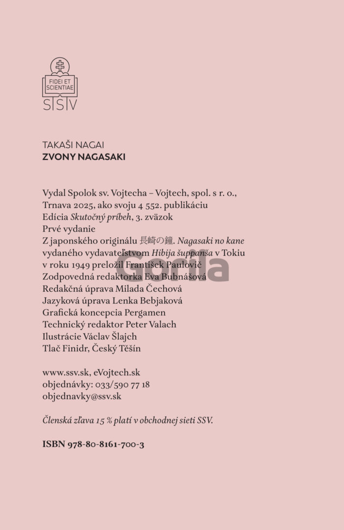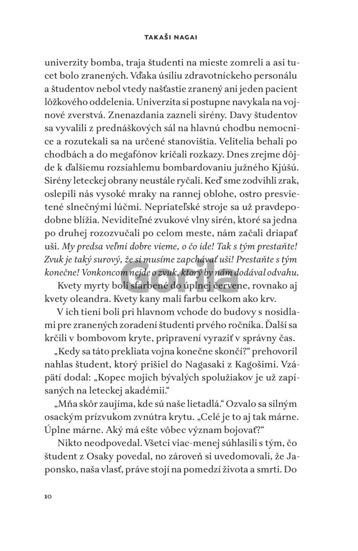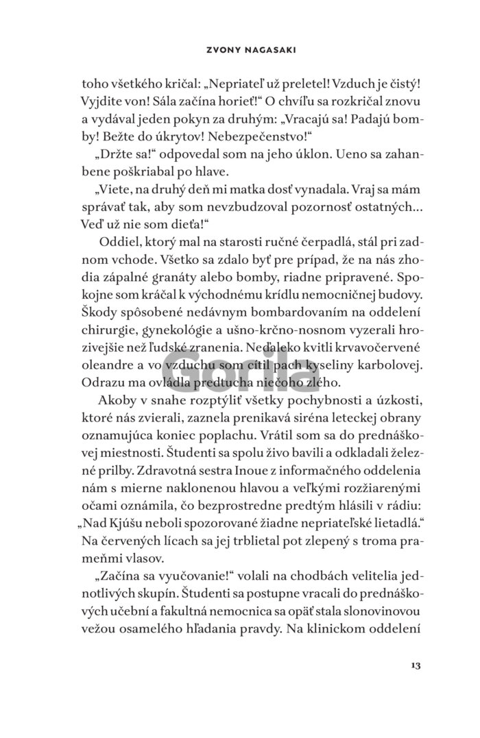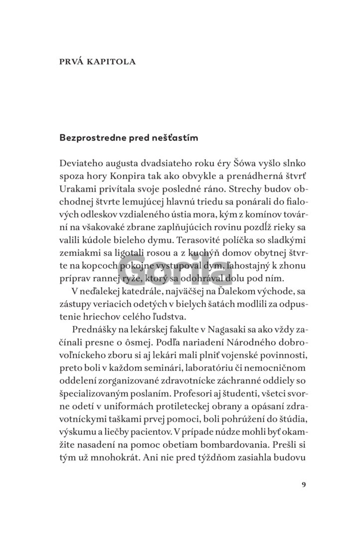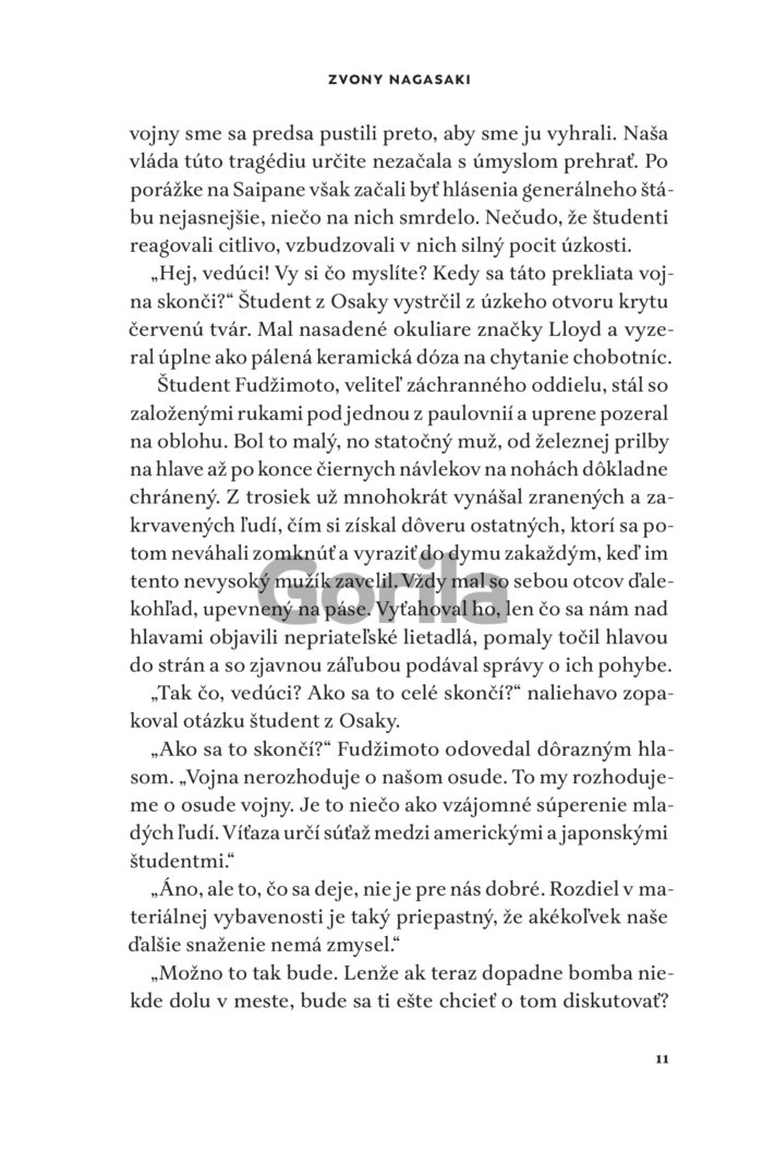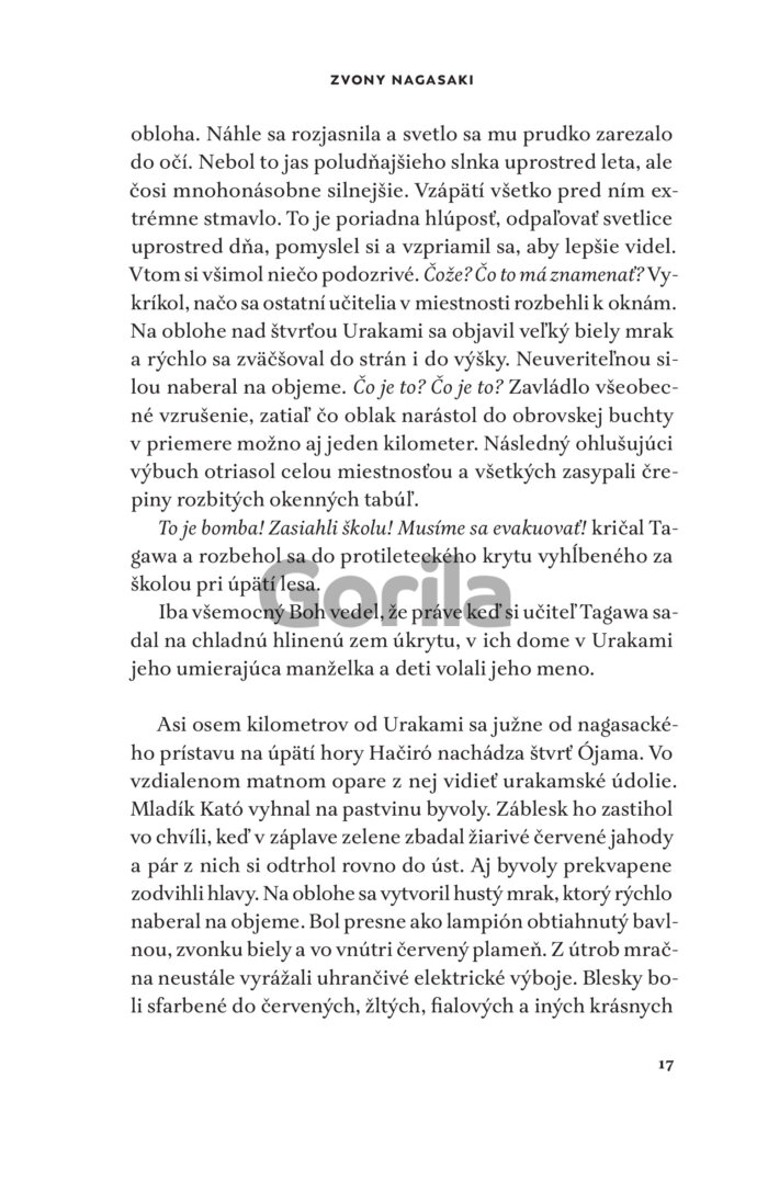 Keď 9. augusta 1945 dopadla na japonské mesto Nagasaki atómová bomba, lekár Takaši Nagai práve slúžil na rádiologickom oddelení miestnej nemocnice. Prežil. A vydal svedectvo. Ako lekár a vedec, ale aj ako kolega, sused, otec a katolík. Zvony Nagasaki nie sú len obrazom hrôzy, ale aj príbehom človeka, ktorý uprostred zúfalstva zahliadol nádej.„Máme nádherné obrazy Jošicuneho bitiek a prekrásne básne o generálovi Nogim, ale aká krása tkvie v atómovej bombe? Ak by ste videli čo len jeden jej záblesk a zažili peklo, ktoré po ňom nastalo, určite by vám už nikdy nenapadlo viesť žiadnu ďalšiu vojnu.“
