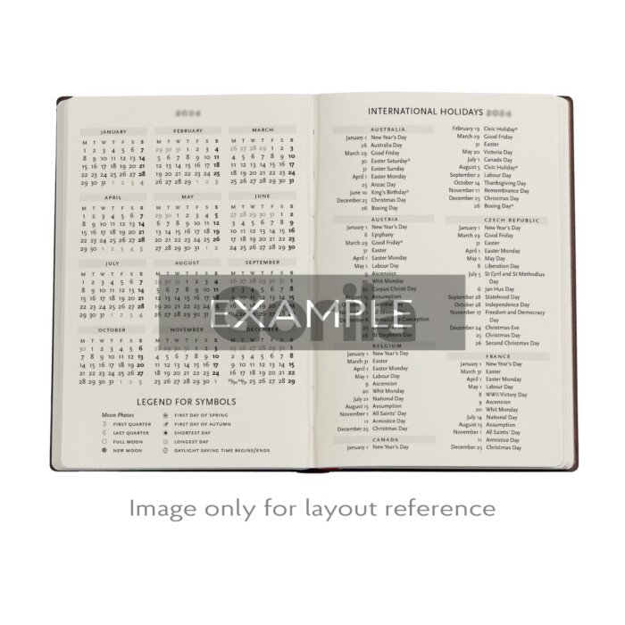 a tiež množstvo užitočných doplnkových strán - napr. mesačné a ročné plánovače, zoznam medzinárodných sviatkov, mini kalendár, doplnkové miesto na poznámky, ...