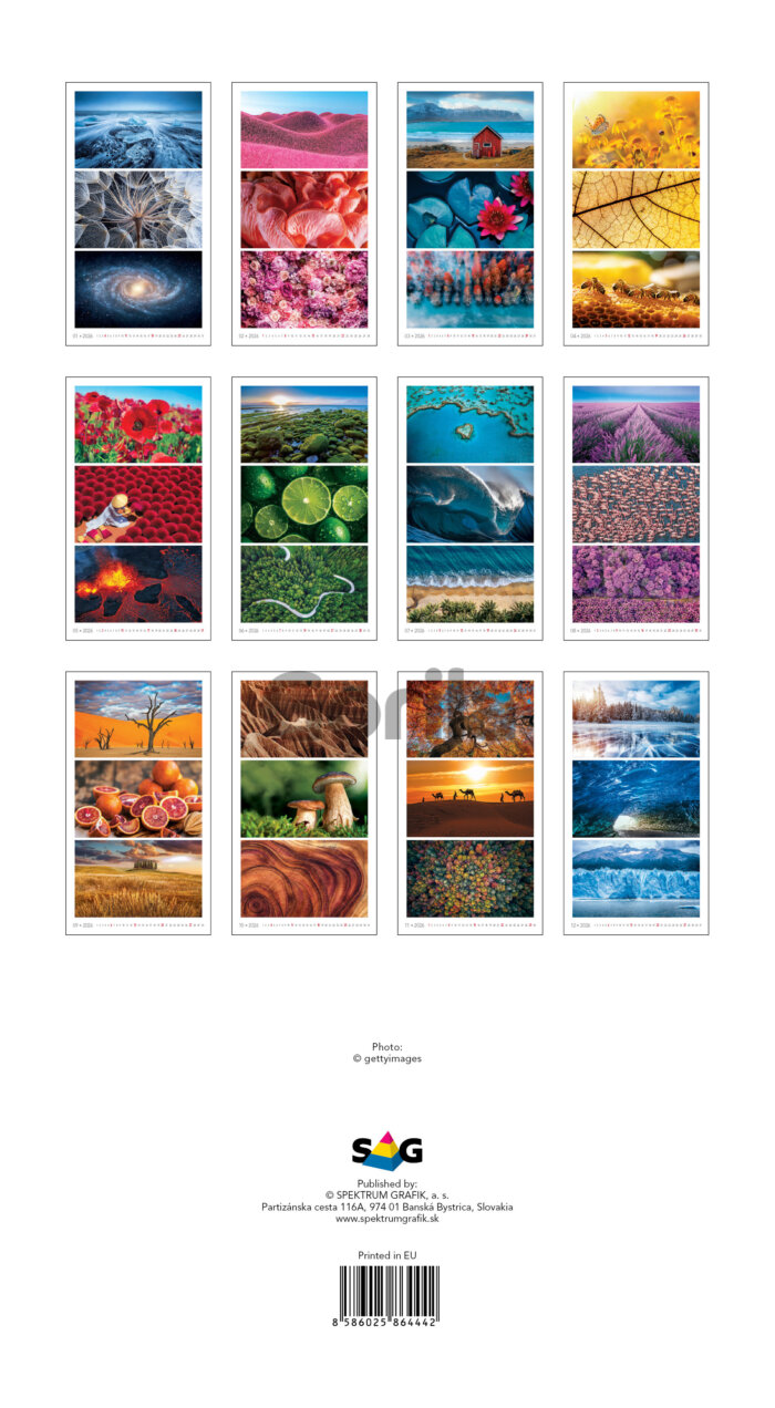 Kalendár, ktorý oslavuje rozmanitosť prírody v jej najfarebnejších podobách. Každý mesiac prináša očarujúce fotografie zachytávajúce žiarivé scenérie – od kvetinových polí a jesenných lesov až po exotické krajiny a fialové levanduľové lány. Ideálny pre tých, ktorí milujú prírodu a jej farebný svet.