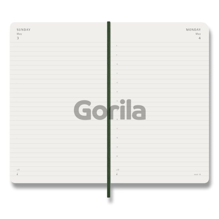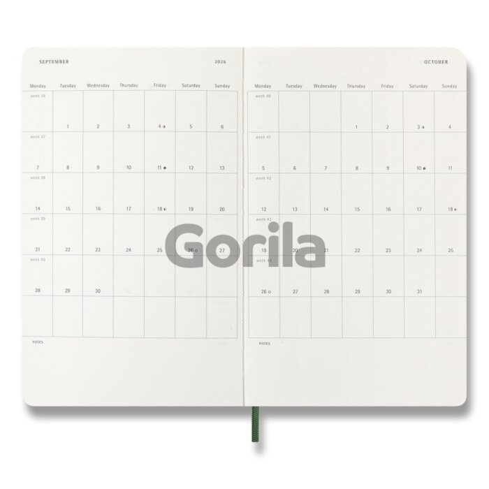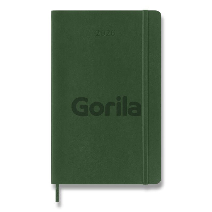 Stredný denný diár na rok 2026. Na každý deň stránka pre poznámky a schôdzky. Diár má mäkkú, v chrbte šitú väzbu v kartónových doskách. Obopína ho pružná gumička proti samovoľnému otváraniu. Obsahuje praktické vnútorné vrecko na vizitky a dokumenty, textilnú záložku, 289 farebných samolepiek a leták s históriou Moleskine. Papier s gramážou 70 g/m², neobsahuje kyseliny.