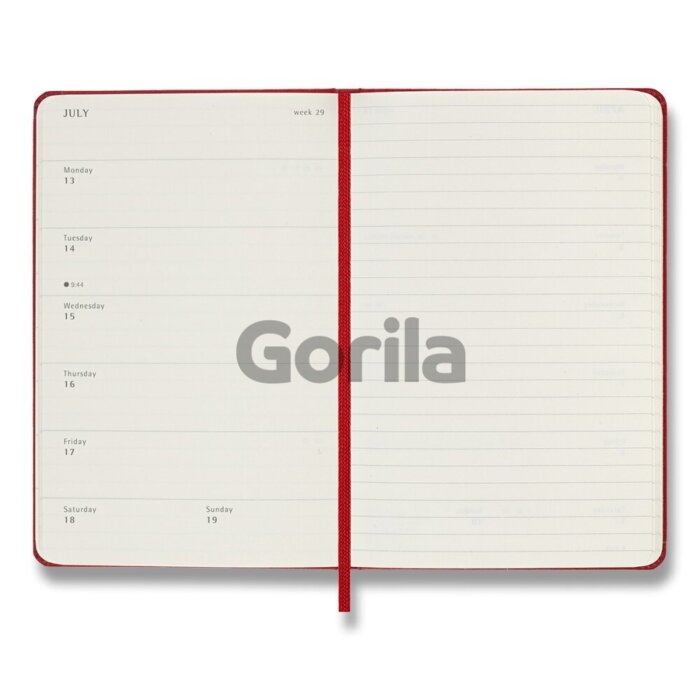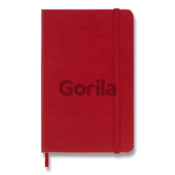 Plánovací diár vreckovej veľkosti na rok 2026. Na ľavej strane sú dni v týždni a na pravej linkovaná stránka na poznámky. Diár má pevnú väzbu v kartónových doskách. Obopína ho pružná gumička proti samovoľnému otváraniu. Obsahuje praktické vnútorné vrecko, textilnú záložku, 295 farebných samolepiek a leták s históriou MOLESKINE. Papier s gramážou 70g/m², neobsahuje kyseliny.