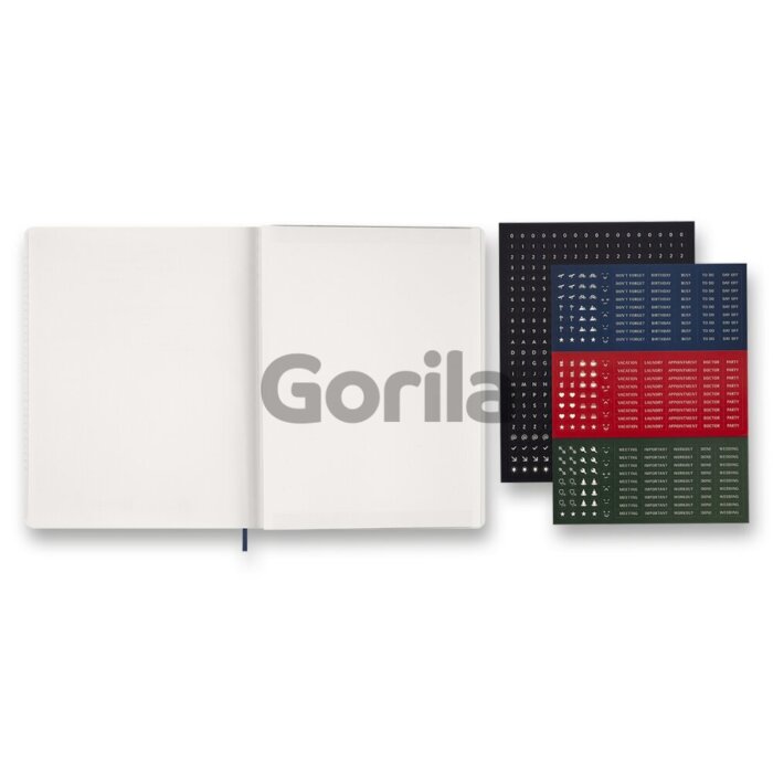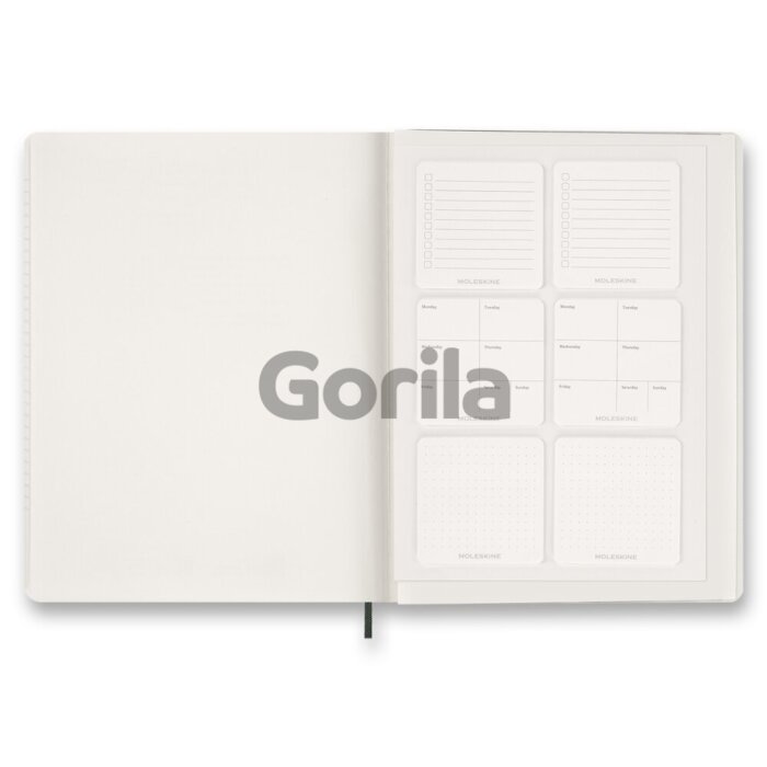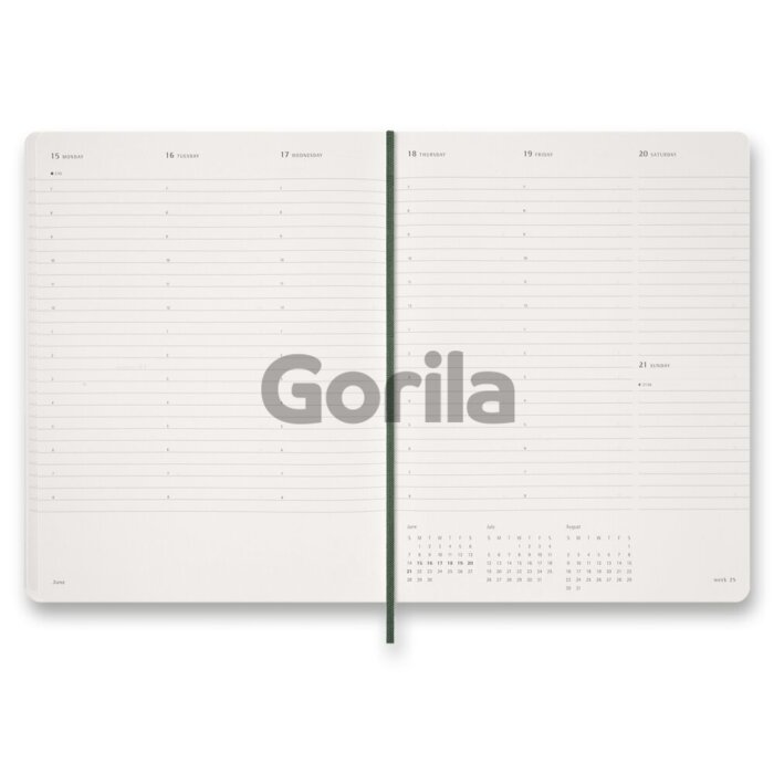 Týždeň je tu zobrazený vertikálne na dvoch stránkach s hodinovými úsekmi od 7 do 20 hodín vo všedné dni a víkendy bez časového obmedzenia. Diár má mäkkú, v chrbte šitú väzbu v kartónových doskách. Obopína ho pružná gumička proti samovoľnému otváraniu. Obsahuje praktické vnútorné vrecko, 3 druhy poznámkových blokov, textilnú záložku, 295 farebných samolepiek a leták s históriou MOLESKINE. Papier s gramážou 70 g/m², v slonovinovej farbe, vyrobený z FSC certifikovaného dreva, neobsahuje kyseliny.